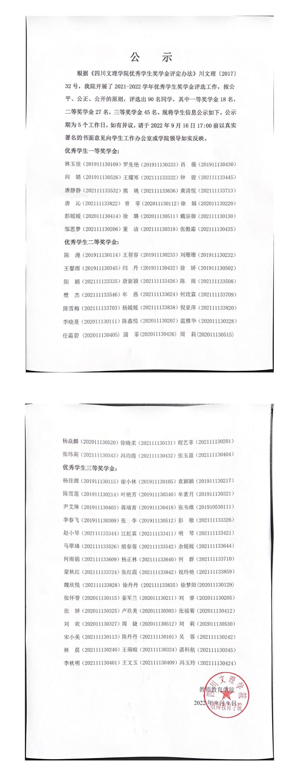 万象城体育awcsport2021-2022学年度优秀学生奖学金公示通知