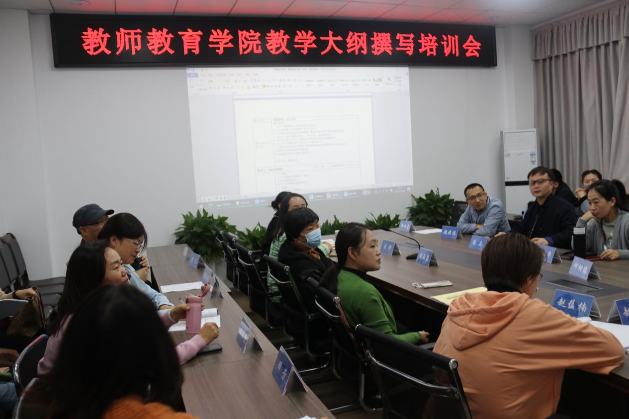 培训会上,赵栅凌副院长重点介绍了本次教学大纲撰写培训会召开的背景、意义。她指出,教学大纲是课程教学的指导性文件,是实现人才培养目标和课程教育目标要求的基础性文件,所有教师要与时俱进,增强学习研究意识。随后,刘勉主任围绕师范专业认证流程图对教学大纲撰写进行详细讲解,具体分析了人才培养方案修订准则以及教学大纲制定的方法,指出要严格按照人才培养方案撰写教学大纲。紧接着,刘勉主任借用白丽华老师的《普通心理学》教学大纲进行实际举例讲解,帮助老师们进一步理解教学大纲撰写的要求和注意事项。最后,各位参会老师针对教学大纲撰写要求进行提问,刘勉主任进行分析解答。