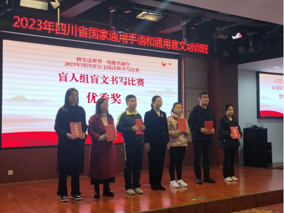 比赛过程中,参赛选手认真摸“读”、“点”写,展现出极高的专业素养与团队协作精神。最终,但锐、代秋宇同学分别荣获四川省盲文阅读和书写比赛优秀奖。通过参加此次比赛,学生的专业实践技能得到提升,同时加强了与其他高校间的交流,进一步普及了国家通用盲文,让全社会更加了解盲人群体与盲人文化。