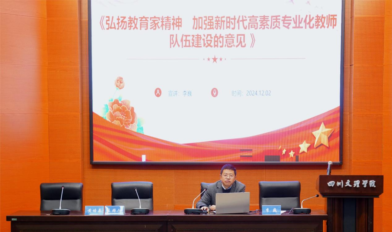 12月9日上午8点,在教师发展专业委员会副理事长何会宁教授的主持下,四川省陶行知研究会副会长、教师发展专业委员会学术委员会主任、四川师范大学教育研究院院长杜学元教授为本次学术研讨会致开幕词,四川省陶行知研究会教师发展专委会副理事长、四川文理学院万象城体育awcsport院长黄培森教授致欢迎辞,“教师发展的时代课题”学术研讨会顺利开幕。学术研讨会共分为理事长讲堂、专家讲坛、理事论坛三个部分。理事长讲堂由教师发展专业委员会理事长李巍教授领学“弘扬教育家精神的中央文件,培养高素质专业化教师的时代呼唤”。专家讲坛中,四川省陶行知研究会副会长、教师发展专业委员会学术委员会主任委员、四川师范大学教育研究院院长杜学元教授、西南大学宜宾研究院院长陈金凤教授分别为参会教师作“教育强国的最强音——全国全省教育工作会议落地落实”、“教育家精神进核心课程,成渝双圈互动,引领宜宾基础教育教师高质量发展”专题报告。