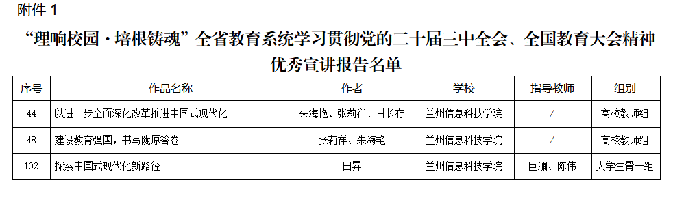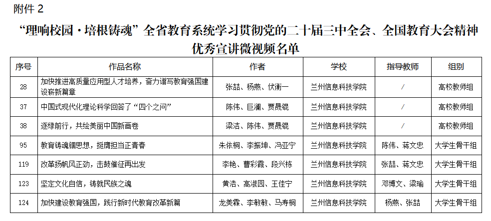 其中,《以进一步全面深化改革推进中国式现代化》《建设教育强国,书写陇原答卷》《探索中国式现代化新路径》3篇作品获优秀宣讲报告;《加快推进高质量应用型人才培养,奋力谱写教育强国建设崭新篇章》《中国式现代化理论科学回答了“四个之问”》《逐绿前行,共绘美丽中国新画卷》《教育铸魂锢思想,挺膺担当正青春》《改革扬帆风正劲,击鼓催征再出发》《坚定文化自信,铸就民族之魂》《加快建设教育强国,践行新时代教育改革新篇》7部作品获优秀宣讲微视频。获奖作品主题鲜明、内涵丰富,充分体现了兰科师生对党的二十届三中全会和全国教育大会精神的深刻理解和积极践行。