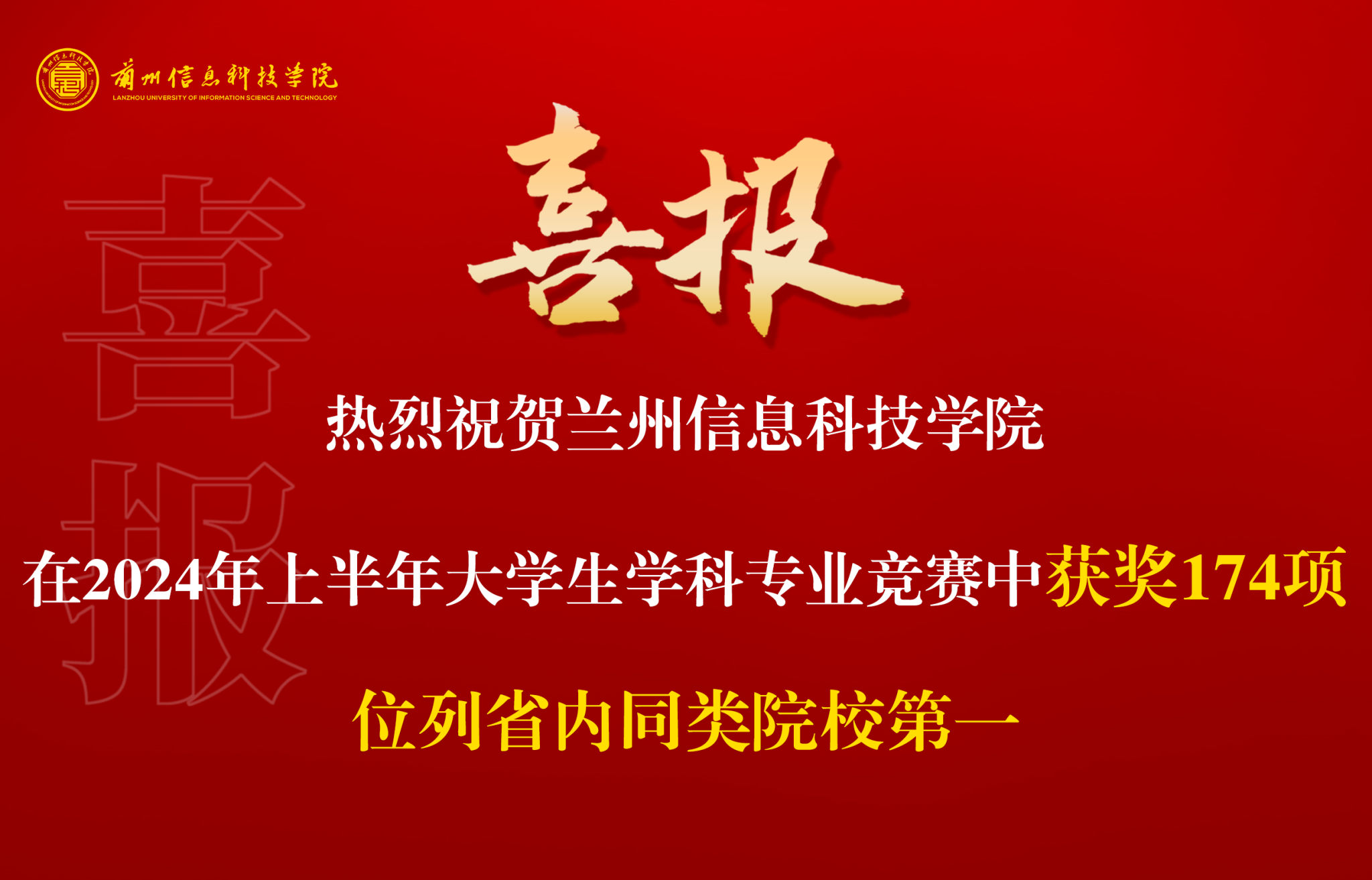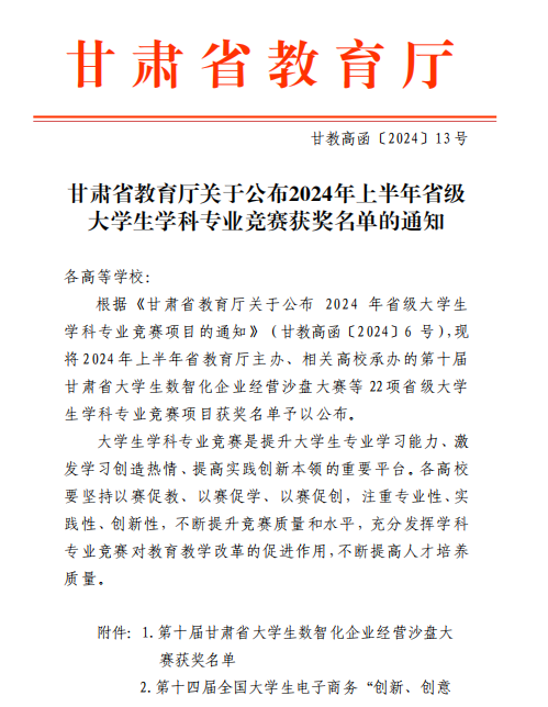 近日,甘肃省教育厅公布了2024年上半年大学生学科专业竞赛获奖名单。beat365英国官方网站在2024上半年省级各类学科竞赛中累计获奖174项(其中5项竞赛为年度目标任务32项重点赛事之一),位列省内同类院校第一,占省内同类院校获奖总数的55.95%。其中特等奖1项,占省内同类院校总数的50%;一等奖39项,占省内同类院校总数的69.64%;二等奖49项,占省内同类院校总数的51.04%;三等奖85项,占省内同类院校总数的54.14%。24位老师被授予“优秀指导教师”荣誉称号,学校6次被评为“优秀组织单位”。较2023年上半年获奖增加了54项,同比增长45.00%。