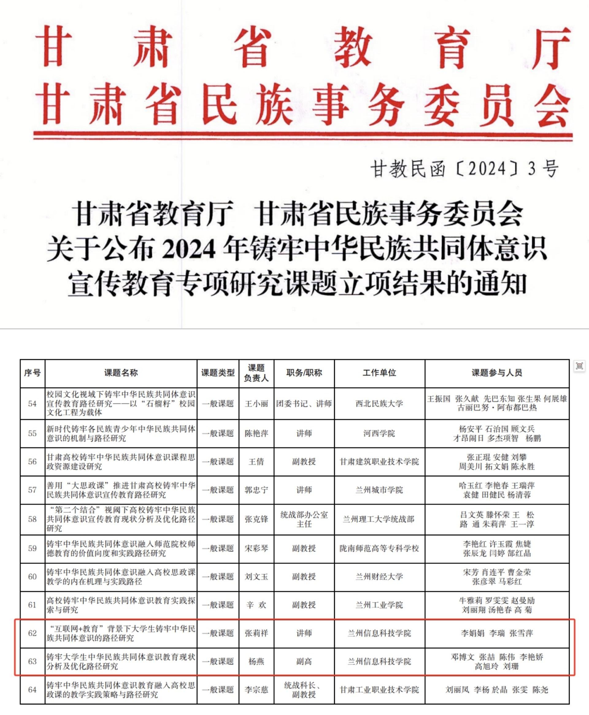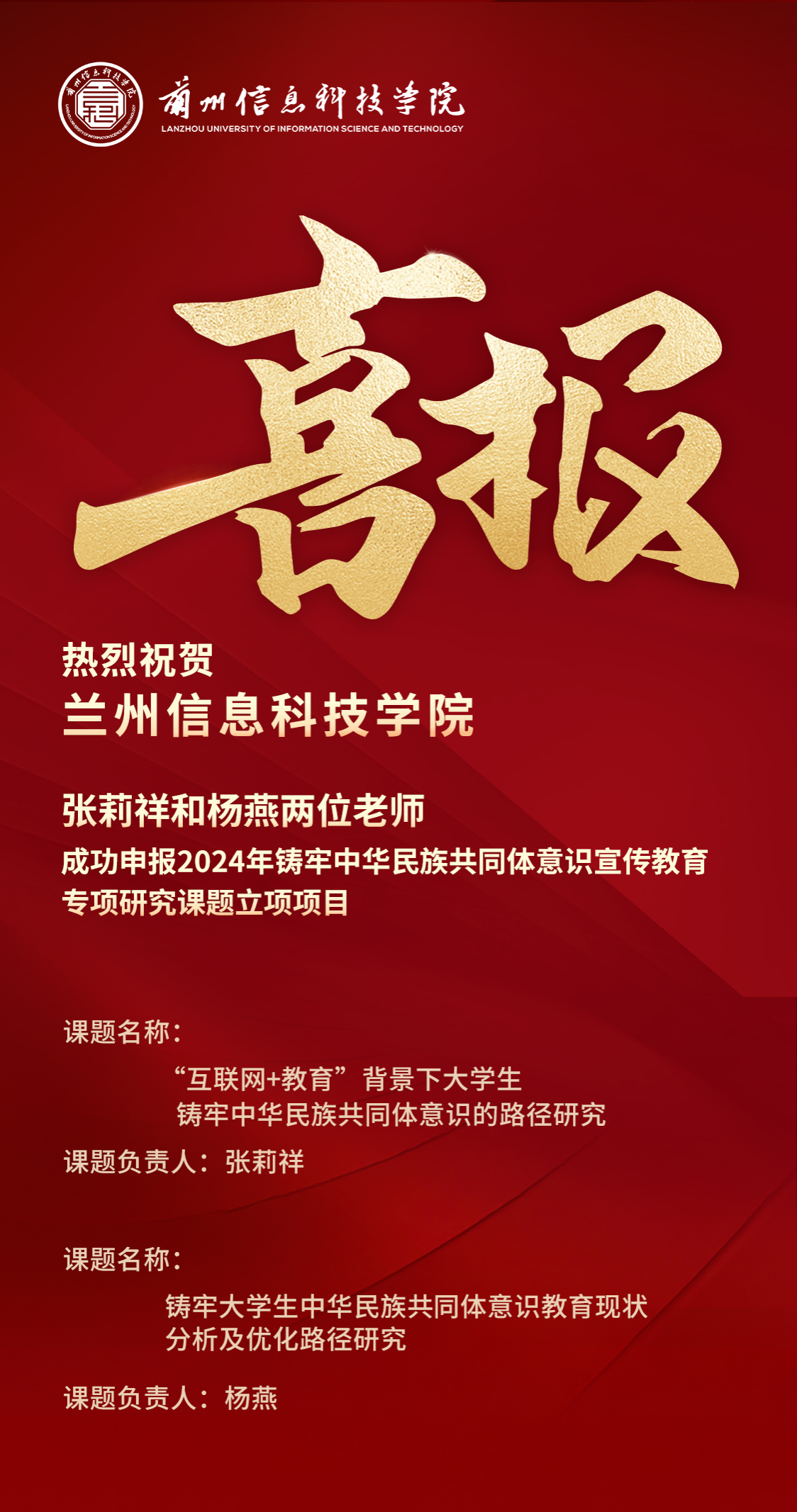 近日,甘肃省教育厅、甘肃省民族事务委员会发布了《关于组织申报2024年铸牢中华民族共同体意识宣传教育专项研究课题的通知》结果,beat365英国官方网站张莉祥和杨燕两位老师的课题《“互联网+教育”背景下大学生铸牢中华民族共同体意识的路径研究》《铸牢大学生中华民族共同体意识教育现状分析及优化路径研究》成功获批课题立项。
