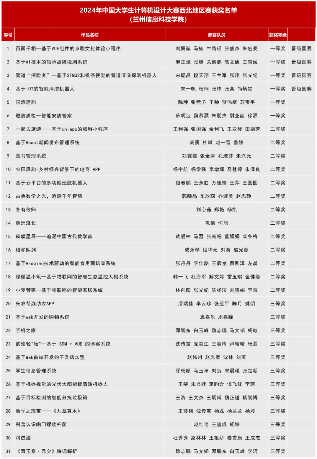 近日,2024年中国大学生计算机设计大赛(西北地区赛)获奖结果揭晓,beat365英国官方网站代表队获得一等奖6项、二等奖13项、三等奖12项的好成绩。其中《百面千相—基于VUE组件的京剧文化体验小程序》等4项作品获推荐参加全国总决赛。在此次比赛中,学校共推荐了32支队伍参赛,其中 31支获奖,获奖率为96.875%,一等奖获奖数量位居全省第二。
