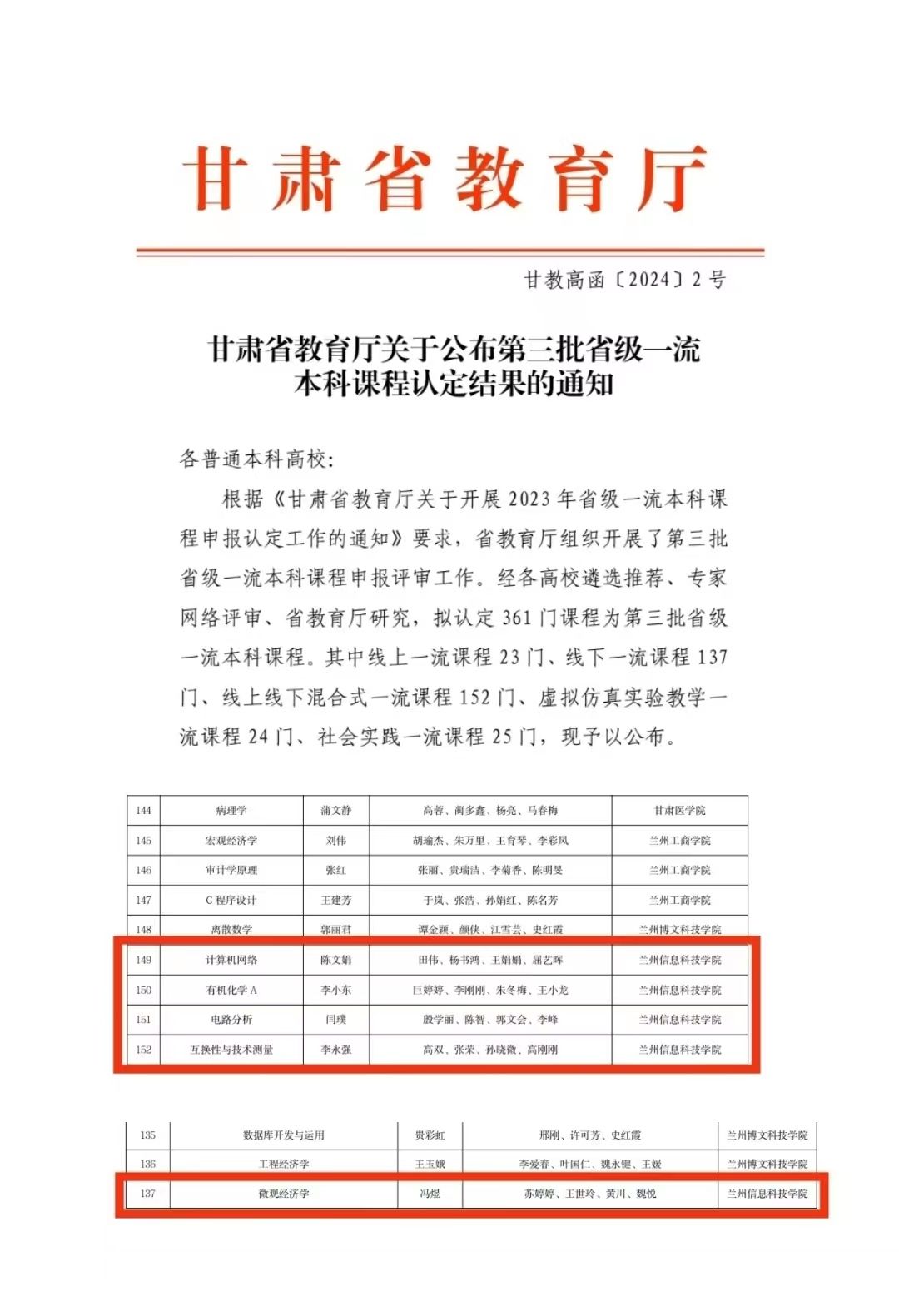 近日,甘肃省教育厅公布了《甘肃省第三批省级一流本科课程认定结果的通知》(甘教高函〔2024〕2号,beat365英国官方网站《计算机网络》、《有机化学A》等5门课程获批第三批省级一流本科课程。至此,学校省级一流课程获批累计至9门,总数位列甘肃省同类院校第一。