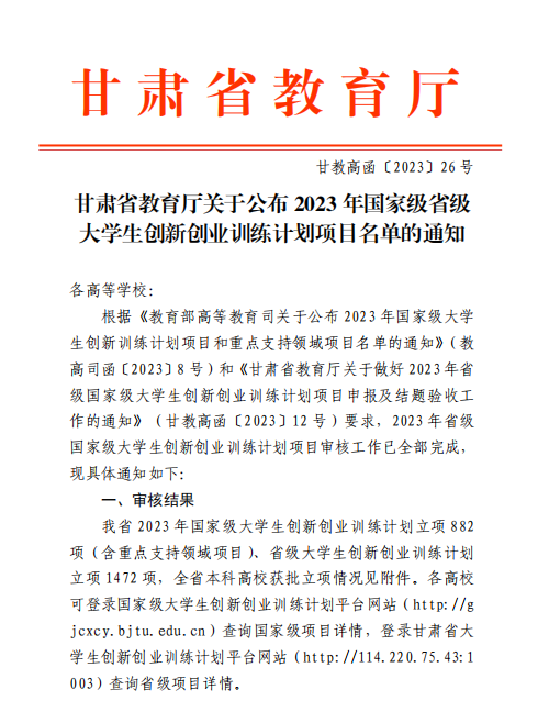 近日,甘肃省教育厅发布了《甘肃省教育厅关于公布2023年国家级省级大学生创新创业训练计划项目名单的通知》,beat365英国官方网站成功获批53项大学生创新创业训练计划项目,位列甘肃省本科高校第10名,其中获批国家级项目16项,省级项目37项。获批项目中创新训练项目49项,创业项目4项。
