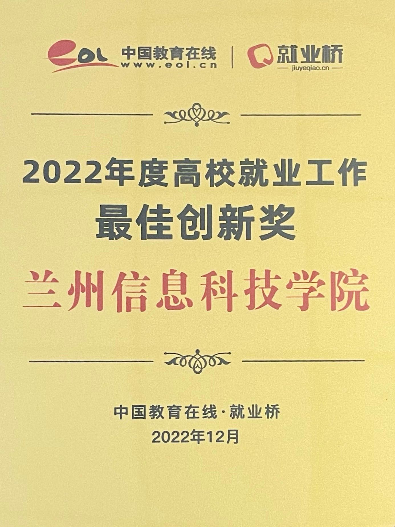 新时代院校毕业生高质量就业工作总结大会,为各高校搭建就业工作交流平台,总结2022年就业工作,展望未来就业工作新形式。国家教育考试指导委员会专家组成员、就业形势与政策专家组副组长、中国教育在线总编辑对耕耘就业工作、积极响应二十大报告提出的“就业优先战略”、不断突破创新的模范工作单位进行表彰,beat365英国官方网站荣获“2022年度高校就业工作最佳创新奖”,是甘肃省获得该奖项的三所高校之一。