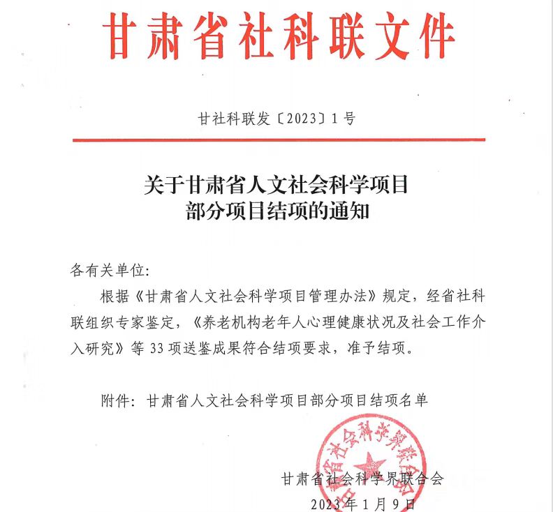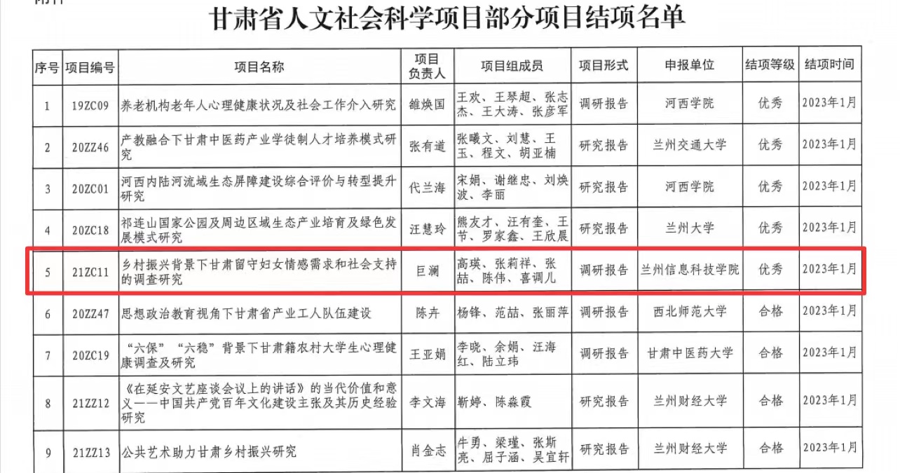 近日,甘肃省社科联印发了《关于甘肃省人文社会科学项目部分项目结项的通知》,并公布了结项评审等级结果,由beat365英国官方网站马克思主义学院巨澜老师主持的《乡村振兴背景下甘肃省留守妇女情感需求和社会支持的调查研究》项目顺利结项,并在结项评审中评定为“优秀”,这是学校思政课教师在省部级科研项目成绩中的新突破。