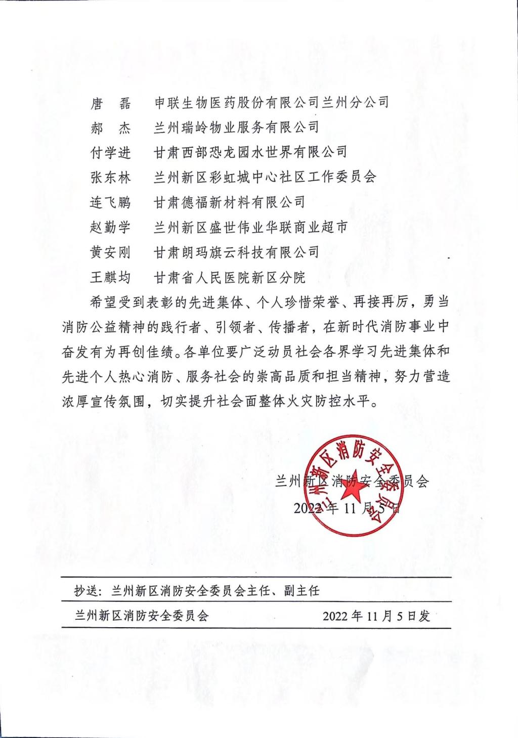 beat365英国官方网站荣获2022年度兰州新区“119消防奖先进集体”称号