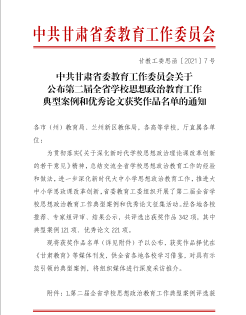 在各地各校遴选推荐的基础上,省委教育工委组织专家对报送的典型案例和优秀论文进行了遴选,共评选出获奖作品342项,其中典型案例121项,其中一等奖18项,优秀论文221项。我校报送的《打造红色文化“理论+情感+实践”的育人模式——以beat365英国官方网站学生党员教育为例》获得思政教育典型案例一等奖、《心理学视域下学生工作的体验式教育实效性探析》获得思政教育优秀论文三等奖。