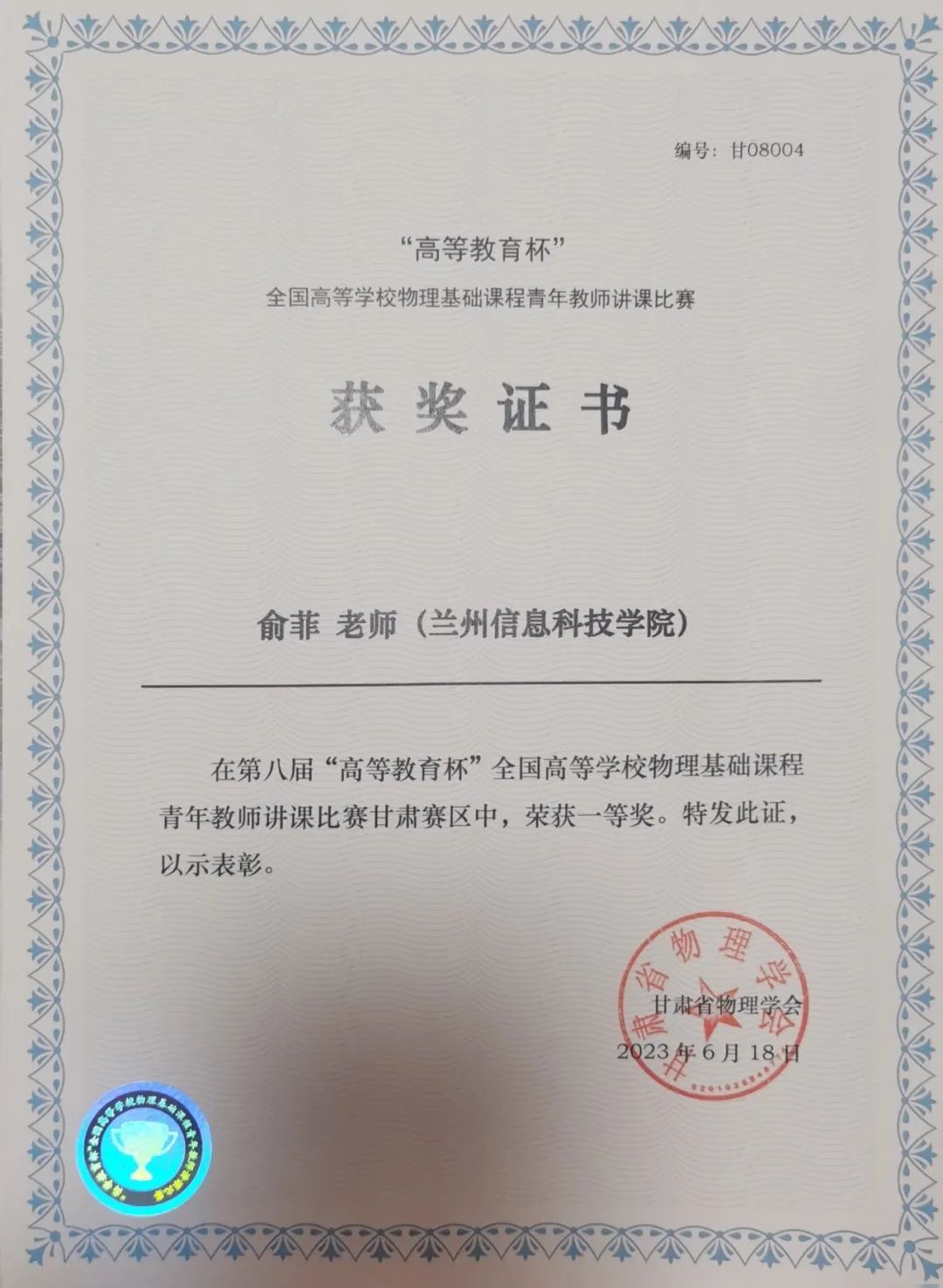 此次获奖对俞老师来说是一次宝贵的成长经历,从准备过程的仔细研读、搜集挖掘素材、认真设计,到准备并熟练参赛课件,赛前的每次磨课都是在不断的给自己提升和进步的空间。她也很感谢在学校、学院的协助下,邀请到教育部大学物理教学指导委员会委员、西北地区工作委员会主任、甘肃省教创赛和青教赛评委专家戴剑峰教授,甘肃省高校教师教学创新大赛评委、兰州理工大学王青教授来校对她进行指导,以及学院里其他物理教师的帮助,让她能进一步修改并完善参赛课件。