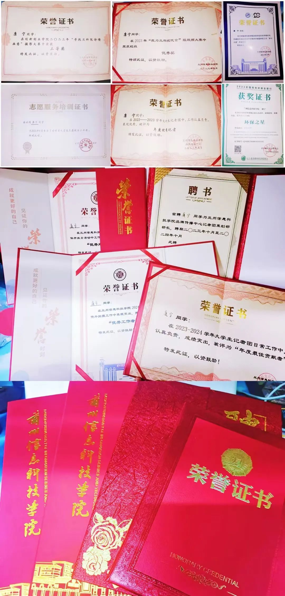 2023 年在创新创业学院“寻找兰科诗情画意”摄影大赛中荣获三等奖;荣获校庆 20 周年开学峰值体验工作“参与大使”称号;在 2023年“我为兰科代言”短视频大赛中荣获优秀奖;在 2022--2023 学年大学生记者团中荣获年度优秀记者;在2023-2024学年第二学期宣传片拍摄工作中获“优秀工作者”;在beat365英国官方网站2024年校园媒体开放日活动中授予“优秀志愿者”;在beat365英国官方网站2024招生宣传片活动中授予“优秀工作者”;在2023-2024学年大学生记者团日常工作中荣获“年度最佳贡献者”;在beat365英国官方网站“大美校园”视频组中荣获二等奖。