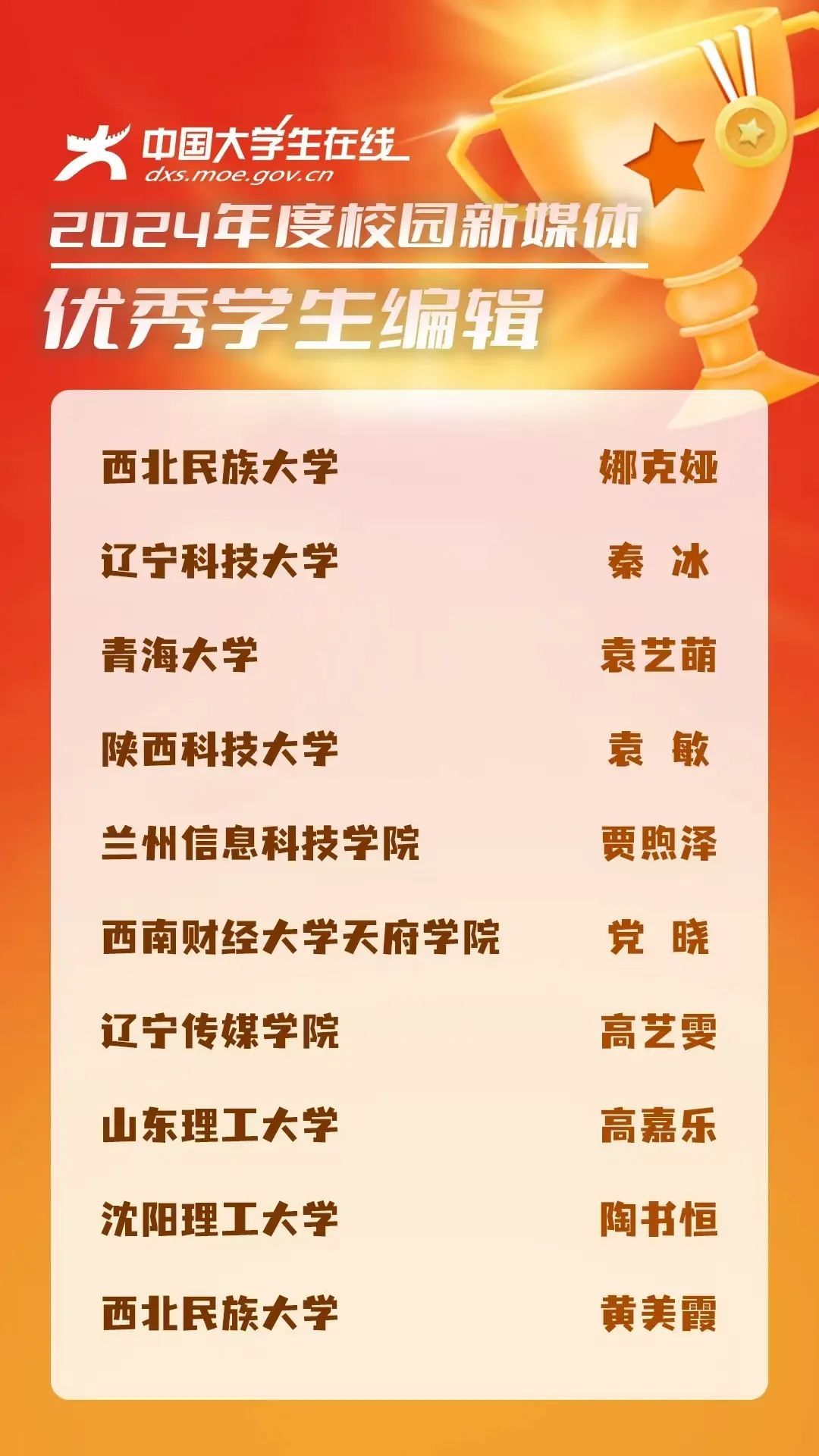 贾煦泽:2022级商学院电子商务专业,2024年度中国大学生在线优秀编辑。目前担任中青校媒(甘肃)主席、微博校园主编、中国大学生在线学生编辑、快手校园ceo、大学生记者团常务副团长、商学院学生会主席、网易新闻浪花校园大使、辅导员助理、副班主任等职务。