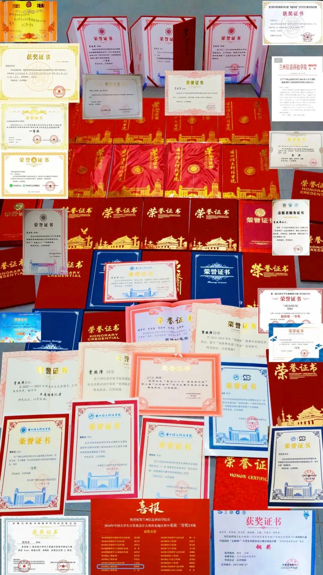 从入校以来,他积极参加各类活动,荣获笔墨中国汉字书写大赛国家二等奖、第二届全国大学生大数据分析技术技能大赛国家二等奖、中国大学生计算机设计大赛西北赛区二等奖、大学生计算机应用能力与数字素养大赛暨第六届传智杯全国IT技能大赛省级一等奖、第九届中国国际“互联网+”大学生创新创业大赛省级铜奖、甘肃省大学生区块链技术创新与应用竞赛三等奖、中国机器人及人工智能大赛(甘肃赛区)优秀志愿者、第十四届“挑战杯”中国大学生创业计划竞赛校赛金奖、第十四届全国大学生电子商务“创新、创意及创业”挑战赛最佳创意奖、beat365英国官方网站2024年度兰科工匠、“山河远阔,人间烟火”校园短视频大赛一等奖、我为兰科院代言短视频大赛特等奖、共抗艾滋,共享健康防艾作品征集大赛一等奖、心灵的赛台成长的驿站心理情景剧视频大赛优秀奖、家乡的年味主题摄影短视频大赛一等奖、大美校园摄影一等奖、微笑的力量主题摄影大赛一等奖等六十余项荣誉;拥有创新创业训练计划项目省级立项一项、国家级软件专利著作一篇;荣获商学院优秀共青团干部、优秀学生干部、beat365英国官方网站优秀工作者、优秀志愿者、优秀队员、优秀记者、先进个人、参与大使、优秀文艺骨干、年度优秀记者、突出贡献者等荣誉称号。