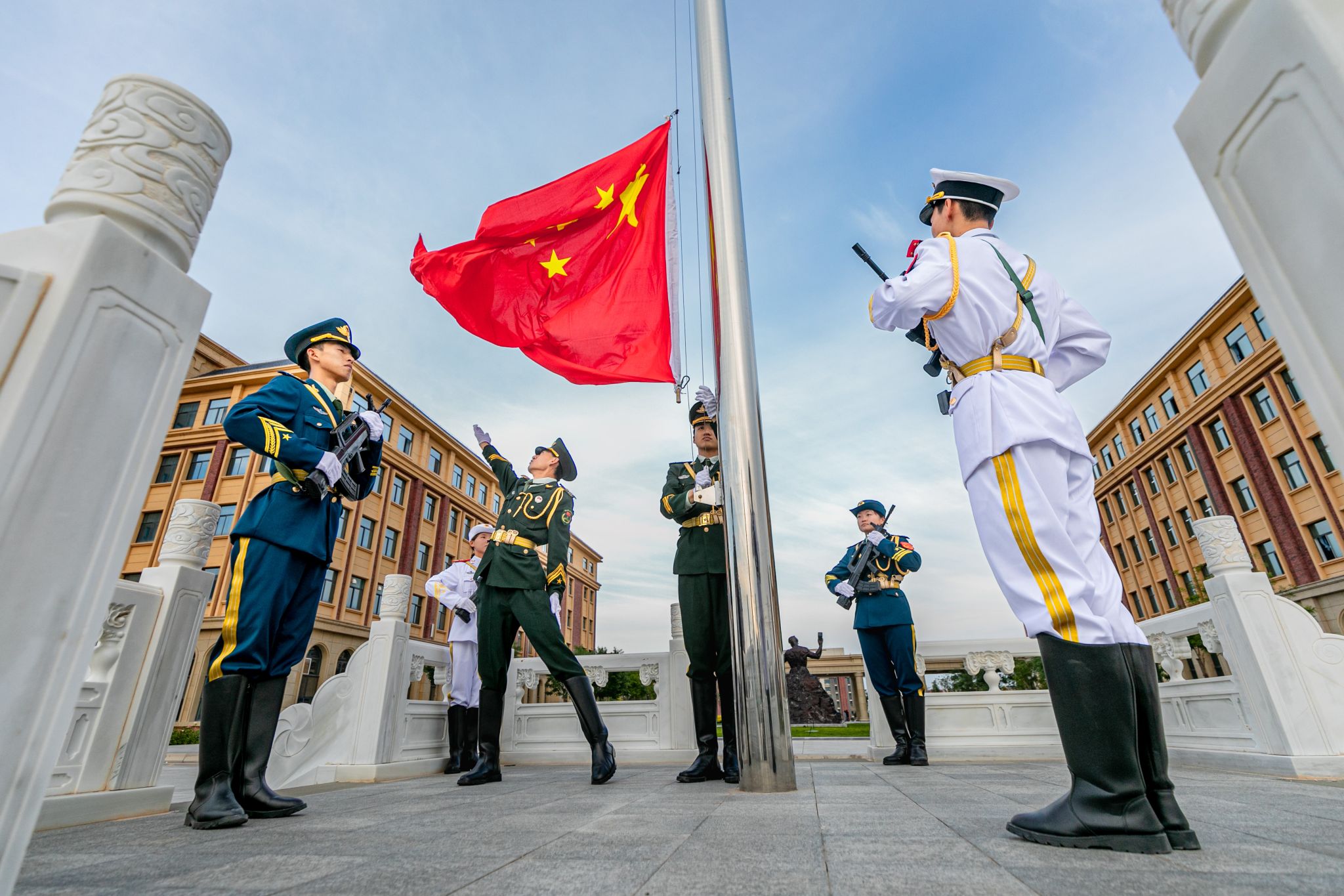 清晨7时许,国旗护卫队队员,整齐列队,为庄严的庆“七一”升国旗仪式做着最后的准备。随着指挥员高亢的口令声响起,队员迈着整齐的步伐,昂首挺胸护送国旗走向升旗台。