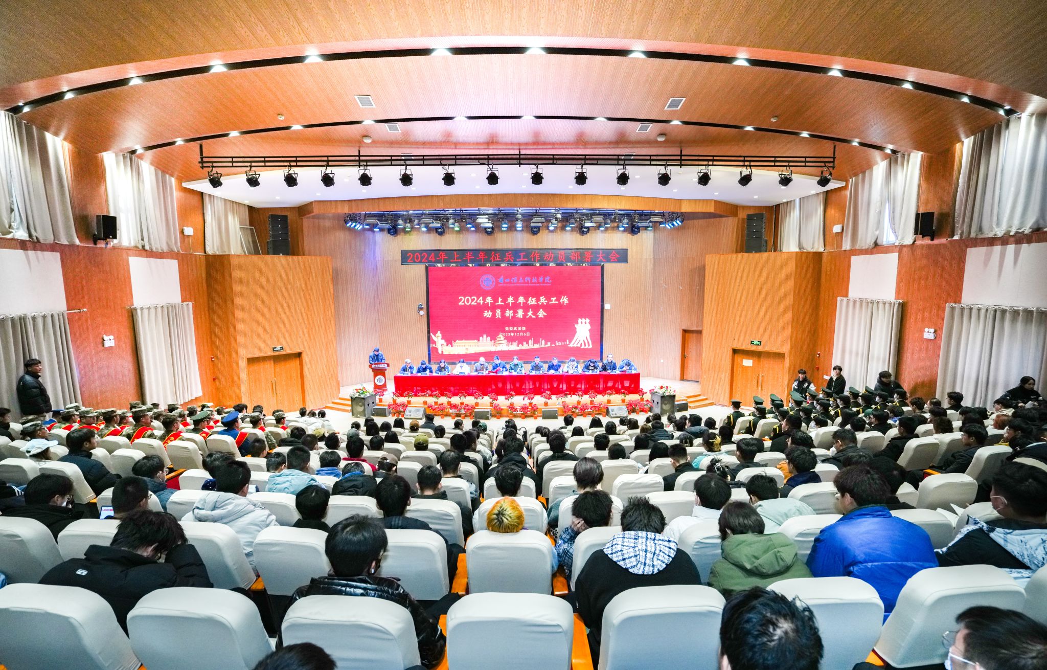 12月6日,beat365英国官方网站2024年上半年毕业生征兵工作动员部署大会在2号学术报告厅举行。皋兰县人民武装部副部长李向阳、校长助理朱明敏及党委武装部、学生处、教务处、就业服务中心、团委全体人员,各二级学院学生副院长、学生发展中心主任、全体辅导员,2024届毕业班班长、团支书,退役复学学生代表、意向入伍学生代表参加动员大会。