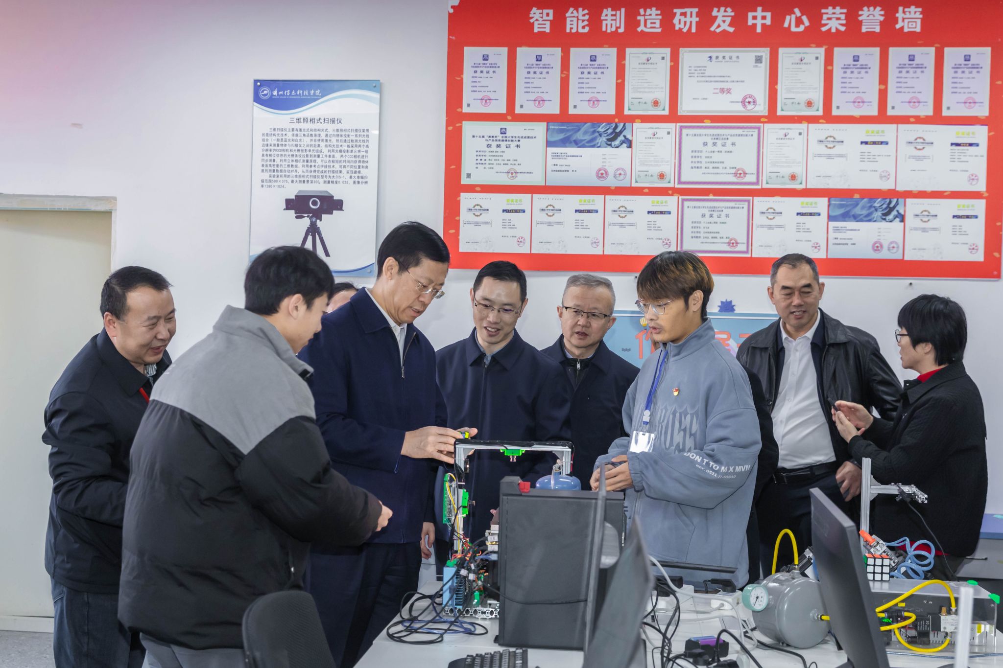 调研期间,胡焯就学校的办学思路、人才培养模式及校园建设环境给予充分肯定。在深入了解了学校承办甘肃省百万职工劳动和技能竞赛等一系列应用型职业技能大赛成果后,高度评价了学校成熟的办赛经验与完善的设备设施。特别是现场观看解魔方机器人精彩表演时,胡焯竖起了大拇指并连连称赞。据了解,解魔方机器人由beat365英国官方网站机电工程学院师生研发,7.6秒可以求解打乱的魔方,该项目研发主要突破技术难关,改善求解算法,优化机械结构,技术水平可与哈尔滨工业大学等一流大学魔方机器人相媲美,目前获得了全国大学生竞赛一等奖,求解速度超全国大学生作品挤占前三。