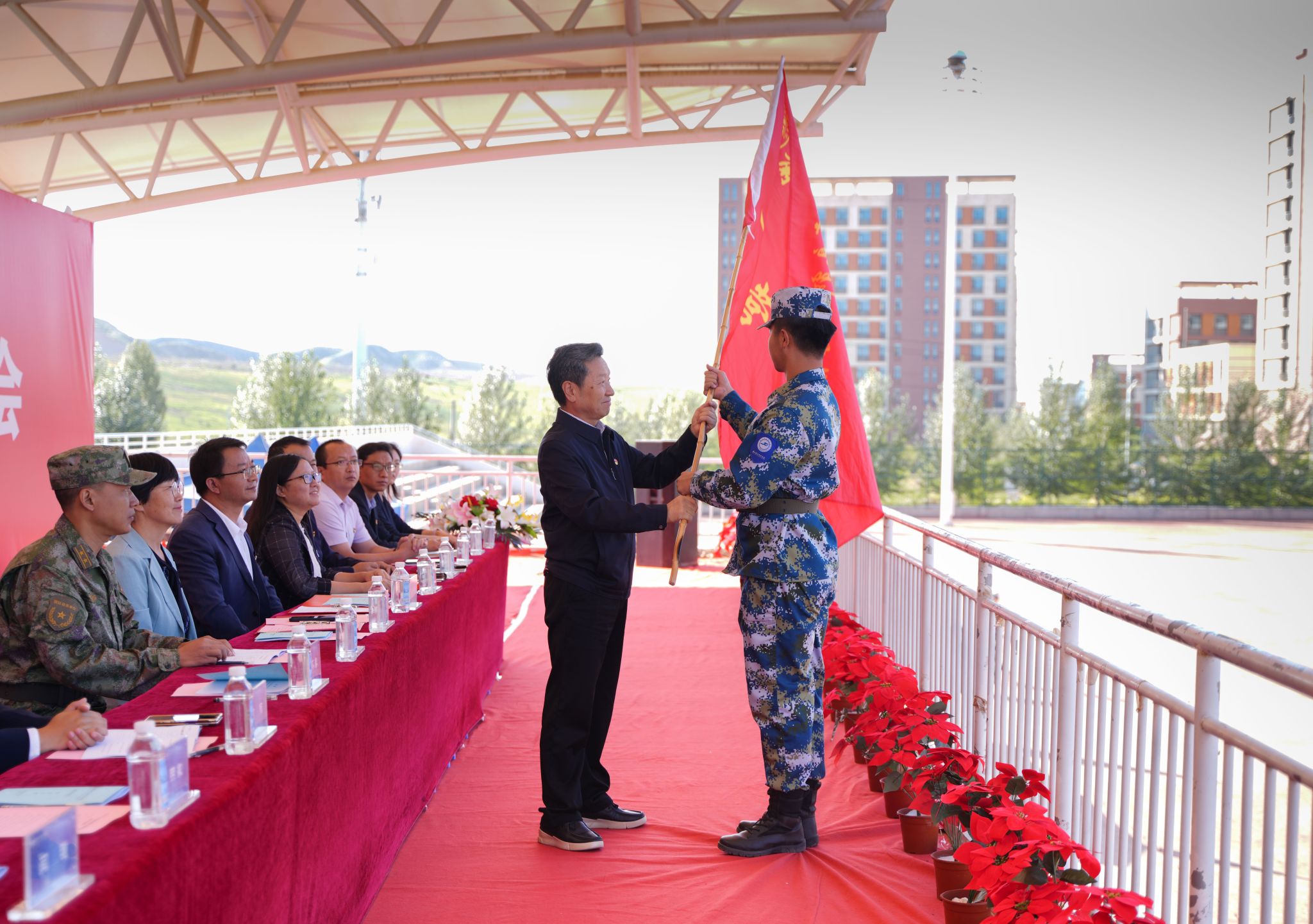 伴随着嘹亮的国歌声,五星红旗徐徐升起。校长助理殷学丽宣读《关于成立beat365英国官方网站2023年学生军训工作领导小组及训练方队的通知》,党委副书记、副校长郭筱磊宣读《关于成立beat365英国官方网站2023年学生军训临时党支部的通知》,党委书记周怀春向军训方队代表授队旗。