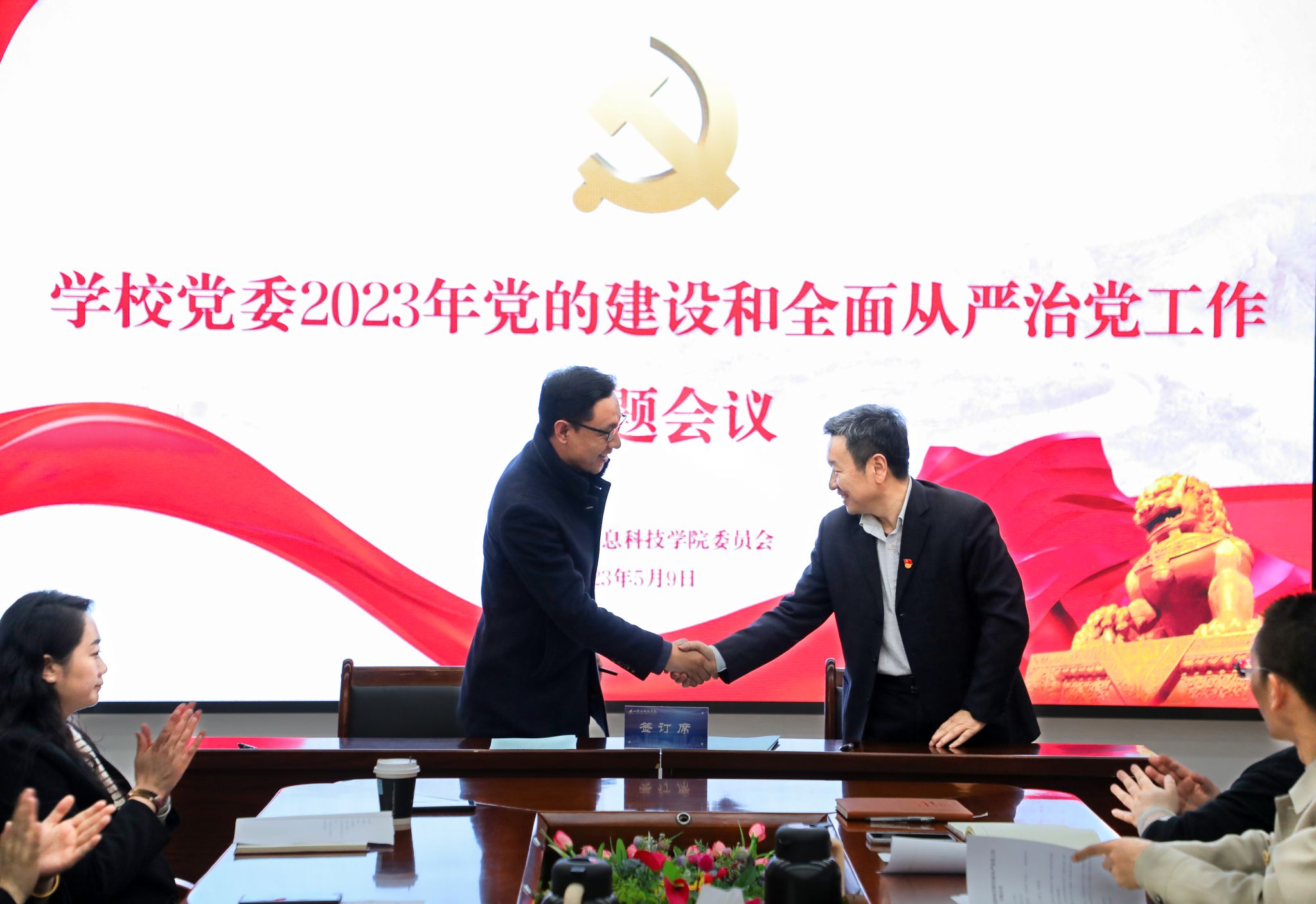 会议强调,党建工作是学校各项工作的基础和核心,是学校培养出更多优秀人才的关键,更是学校高质量发展的重要依托,做好学校党建工作意义重大。会议就进一步做好党的建设和全面从严治党工作提出要求。一是以学习贯彻党的二十大精神为主线,全面推进学校党的建设。要深入贯彻落实党的二十大做出的全面从严治党战略部署,高度重视意识形态工作,增强党组织政治功能和组织功能,打造高质量党建文化,全面落实新时代党的建设总要求,推动党的二十大精神落实落地。二是提高政治站位,增强全面从严治党政治自觉和行动自觉。要深刻认识做好全面从严治党工作的重要性和紧迫性,以高度的政治自觉思想自觉行动自觉,坚定捍卫“两个确立”,忠诚践行“两个维护”。坚定全面从严治党永远在路上的信念,真正把全面从严治党落实到学校党的建设全过程,转化为学校高质量内涵式发展的奋进力量与具体行动。三是强化责任担当,把管党治党的责任扛在肩上。要强化守土有责、守土担责、守土尽责的政治担当,探索构建全面从严治党“四责协同”机制,加大全面从严治党责任传导力度,扭住责任制这个“牛鼻子”,不折不扣落实全面从严治党责任,不断提高履职尽责本领,努力提高战胜各种风险挑战能力。四是持续正风肃纪,坚定不移推动全面从严治党纵深发展。要深入推进形式主义和官僚主义整治工作,全面加强师德师风建设,大兴调查研究、求真务实之风。要严肃执纪问责,强化制度建设,保持反腐高压态势,一体推进“三不”长效机制建设,持续推进廉洁校园建设。