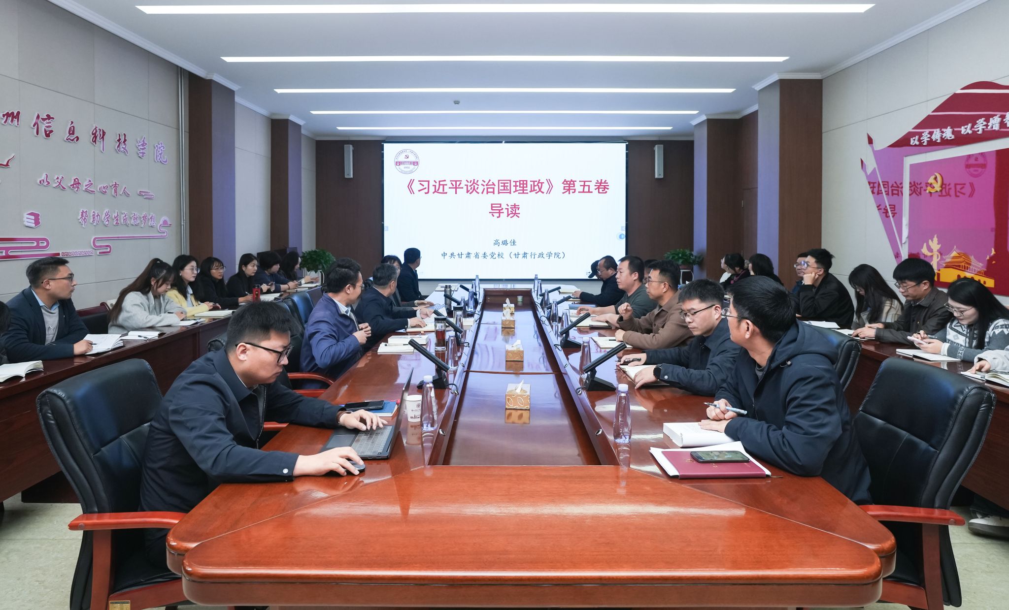 中共甘肃省委党校(甘肃行政学院)教务处处长高璐佳教授应邀作专题辅导报告。高璐佳教授以《习近平谈治国理政》第五卷导读为主题,围绕《习近平谈治国理政》系列的编辑出版情况、第五卷的精髓要义及学习运用第五卷的方法三个方面开展专题辅导报告。辅导报告视野宏阔、内涵丰富、思想深邃、语言朴实,具有很强的政治性、理论性和系统性,为学校深入学习贯彻习近平新时代中国特色社会主义思想提供了有力指导。