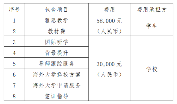 4.费用标准:88,000元/生,学校资助30,000元,学生自费58,000元,包括: