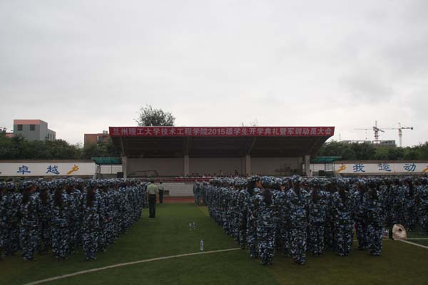 2015年9月9日上午8:30,学院2015级学生开学典礼暨军训动员大会在田径运动场隆重举行。武警甘肃总队第一支队三大队副教导员刘小永,学院院长赵万勇,党委书记周怀春,副院长谢黎明,院长助理兼财务处处长谭蓉及相关部门负责人出席了典礼。全体军训教官、辅导员和2015级全体新生参加了大会。大会由学生处处长朱明敏主持。