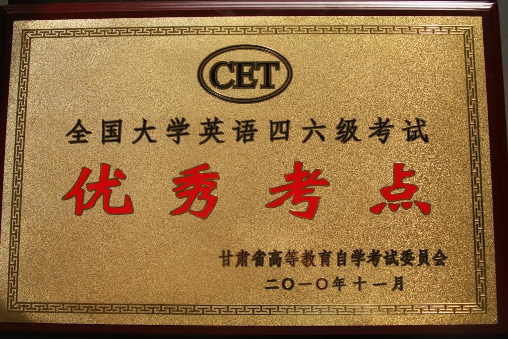 2010年11月26日,经过甘肃省高等教育自学考试委员会评定,学院被授予“甘肃省全国大学英语四六级考试优秀考点”称号,学院教务处副处长兼教学管理科科长殷学丽被授予“全国大学英语四六级考试、高等学校英语应用能力考试先进工作者”称号。