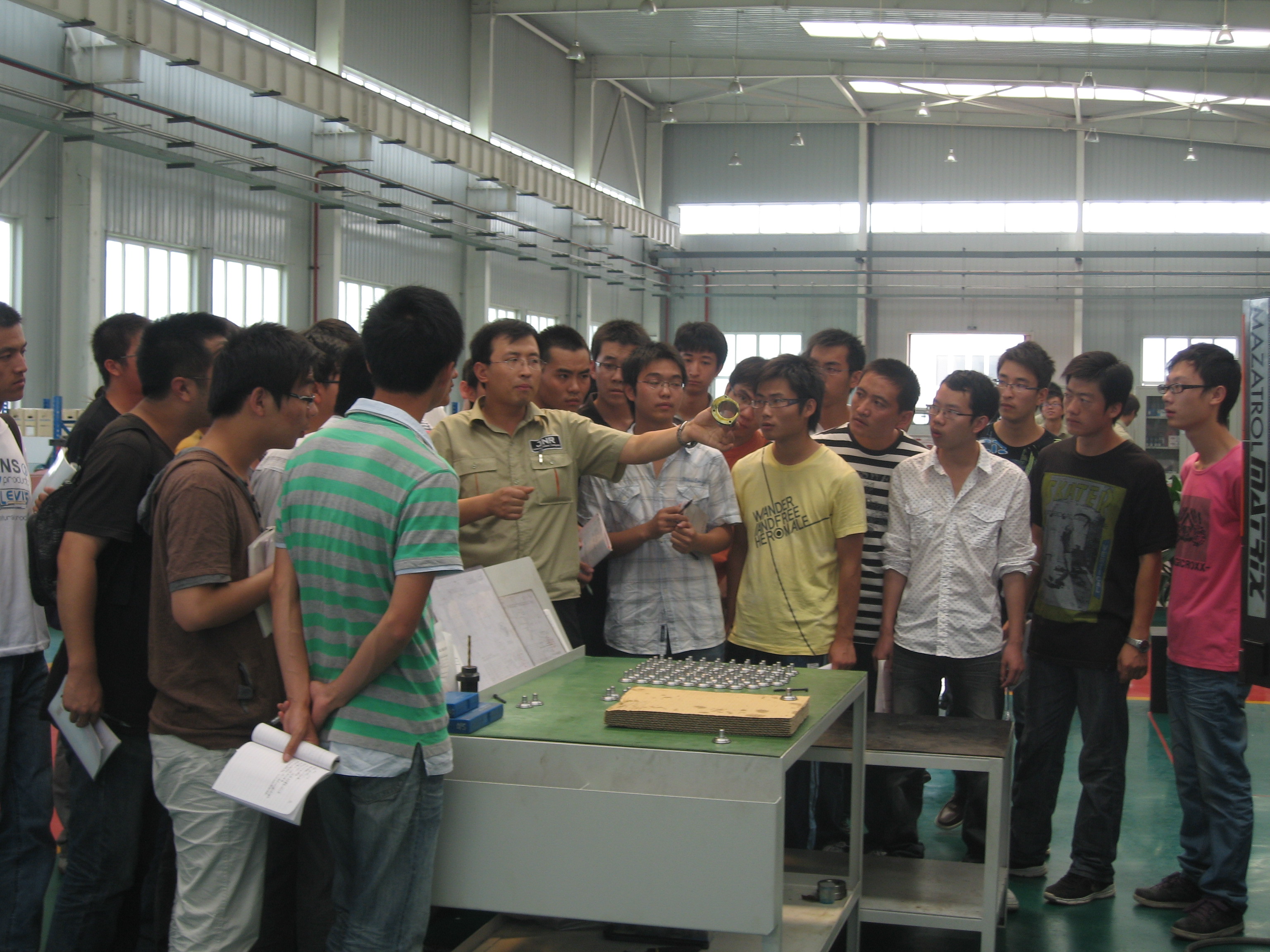 2010年8月1日至12日,机械教研室组织“机械设计制造及其自动化”专业239名学生赴宁夏回族自治区银川市进行了生产实习。此次实习在“西北轴承厂”、“宁夏小巨人机床有限公司”、“宁夏新瑞长城机床有限公司”、“宁夏巨能机器人有限公司”、“宁夏银川大河数控机床有限公司”、“宁夏银川长城液压件厂”等单位进行。在实习过程中,该专业学生通过参观生产一线,对各种生产设备、生产工艺等产生了感性认识;通过企业技术人员的讲解,对机床的工作原理和组成结构有了比较深入的了解。此次实习为机械装备、机械专业课程设计以及毕业设计等打下了良好的基础,也使学生对就业及工作环境有了一定的认识和了解。