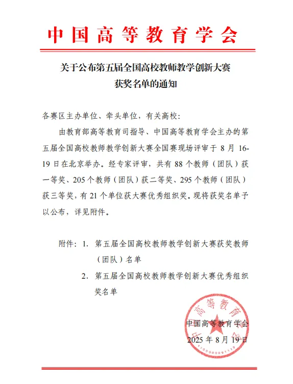 8月17—19日,由教育部高等教育司指导、中国高等教育学会主办的第五届全国高校教师教学创新大赛在北京理工大学举行,该赛事是引领高等教育高质量发展的国家级最具权威、参与教师最多、影响力最大的教学竞赛。本届大赛共设32个赛区,覆盖所有本科高校、所有学科门类,吸引了来自全国1308所高校12.7万名优秀教师参赛,通过课堂实录、课堂创新报告、教学设计创新汇报等环节,最终来自复旦大学、同济大学、浙江大学等366所本科高校、2253名教师携588门课程跻身全国赛同台竞技。