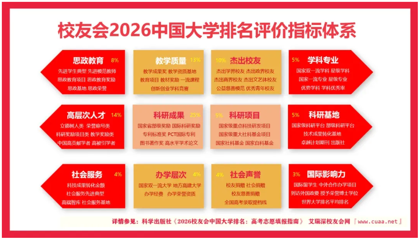 校友会2026中国大学排名评价院校涵盖我国海峡两岸暨香港澳门地区的2000多所公办本科大学、民办大学(含独立学院)、中外合作办学大学、职业技术大学和高职(专科)院校等高校。由办学层次、思政教育、教学质量、杰出校友、高层次人才、学科专业、科研项目、科研基地、科研成果、社会服务、社会声誉和国际影响力等12个一级指标组成,基于“大平台、大团队、大项目、大成果、大校友”体系框架展开系统评价,覆盖的评估指标高达900多项,对全国广大高考考生及家长更具参考价值和指导意义。