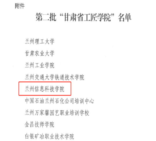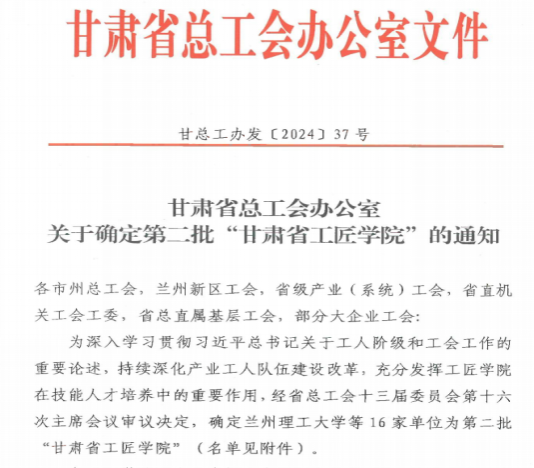 学校深化校企合作,推进产教融合,紧跟产业变革和国家战略需求,服务地方经济社会发展,面向重点地区、重点行业和重点产业,充分利用和开发学校优质的教育教学资源,在全省上下打造甘肃独具特色的“工”字号亮丽品牌、开展百万职工劳动和技能竞赛向县域和非公企业延伸的良好契机下,创新思路,2024年成功申报并获批第二批“甘肃省工匠学院”。