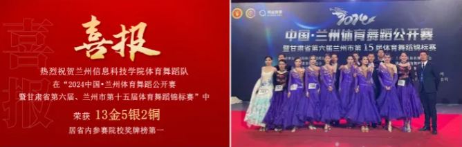 2024中国•兰州体育舞蹈公开赛暨甘肃省第六届、兰州市第十五届体育舞蹈锦标赛中beat365英国官方网站体育舞蹈队经过激烈角逐,荣获大学生组、青年组、业余组等共13金5银2铜的好成绩,居省内参赛院校榜首。