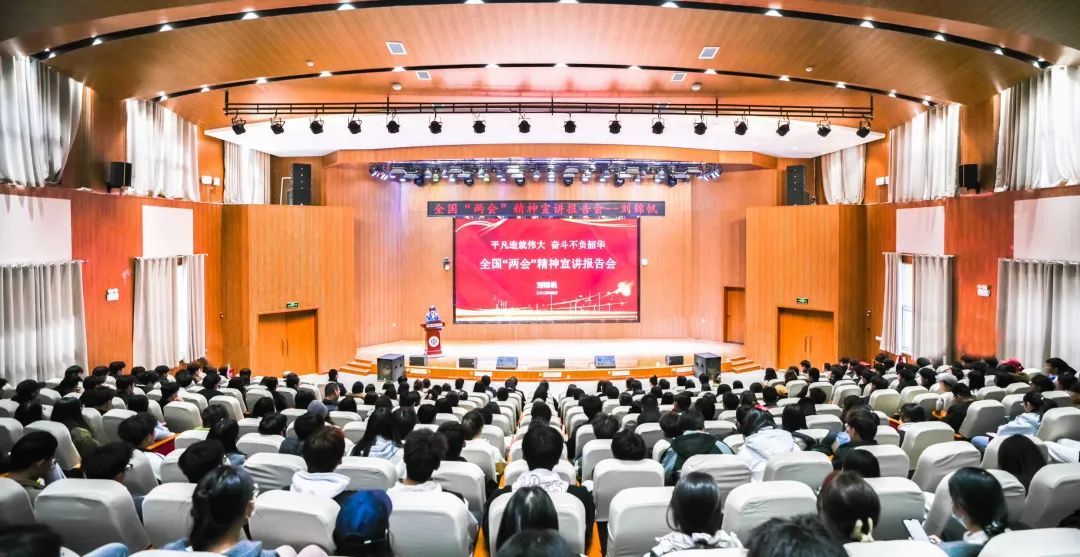 当天上午,刘锦帆校友在2号学术报告厅为母校师生作2025年全国“两会”精神报告,全校千余名师生齐聚一起,共同聆听“两会”精神。