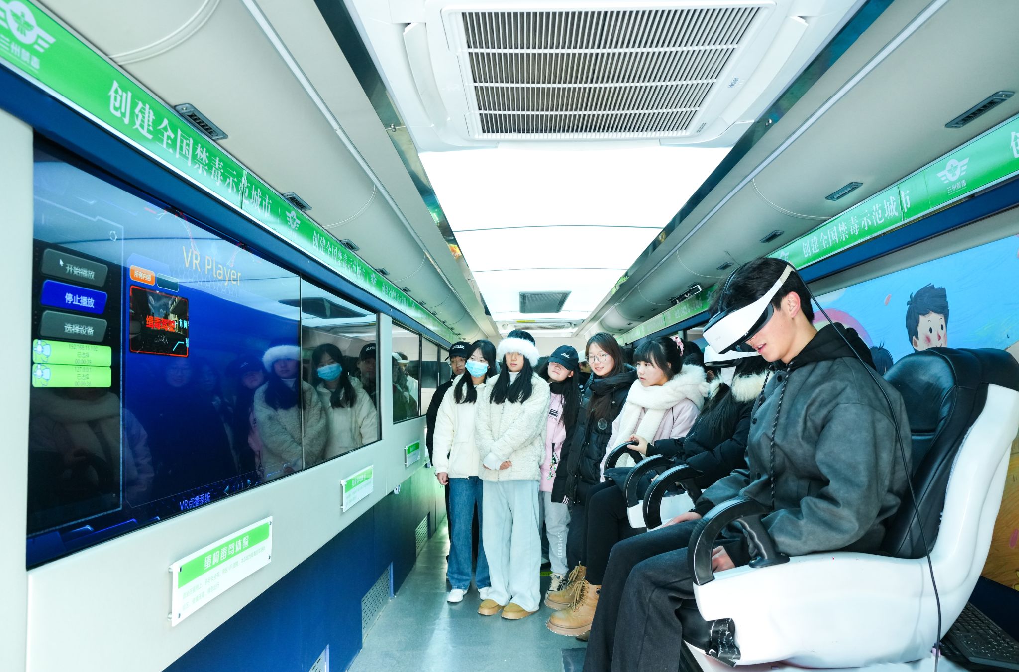 在工作人员的引导下,师生们有序登上宣传车进行参观学习。戴上VR 设备,体验者仿佛置身于毒品危害的模拟场景之中,亲眼目睹了毒品对身体和精神造成的严重摧残,真切感受到了毒品给个人、家庭和社会带来的巨大灾难。这种沉浸式的体验让许多师生深受触动。车内的多媒体互动展示设备以图文、视频等形式详细地介绍了传统毒品,如鸦片、海洛因,以及新型毒品如冰毒、摇头丸、K 粉、麻古等的特征和伪装形式。同时还讲解了毒品犯罪的相关法律法规知识,提醒大家在日常生活中要提高警惕,防范新型毒品的侵害,切勿因好奇而陷入毒品的陷阱。