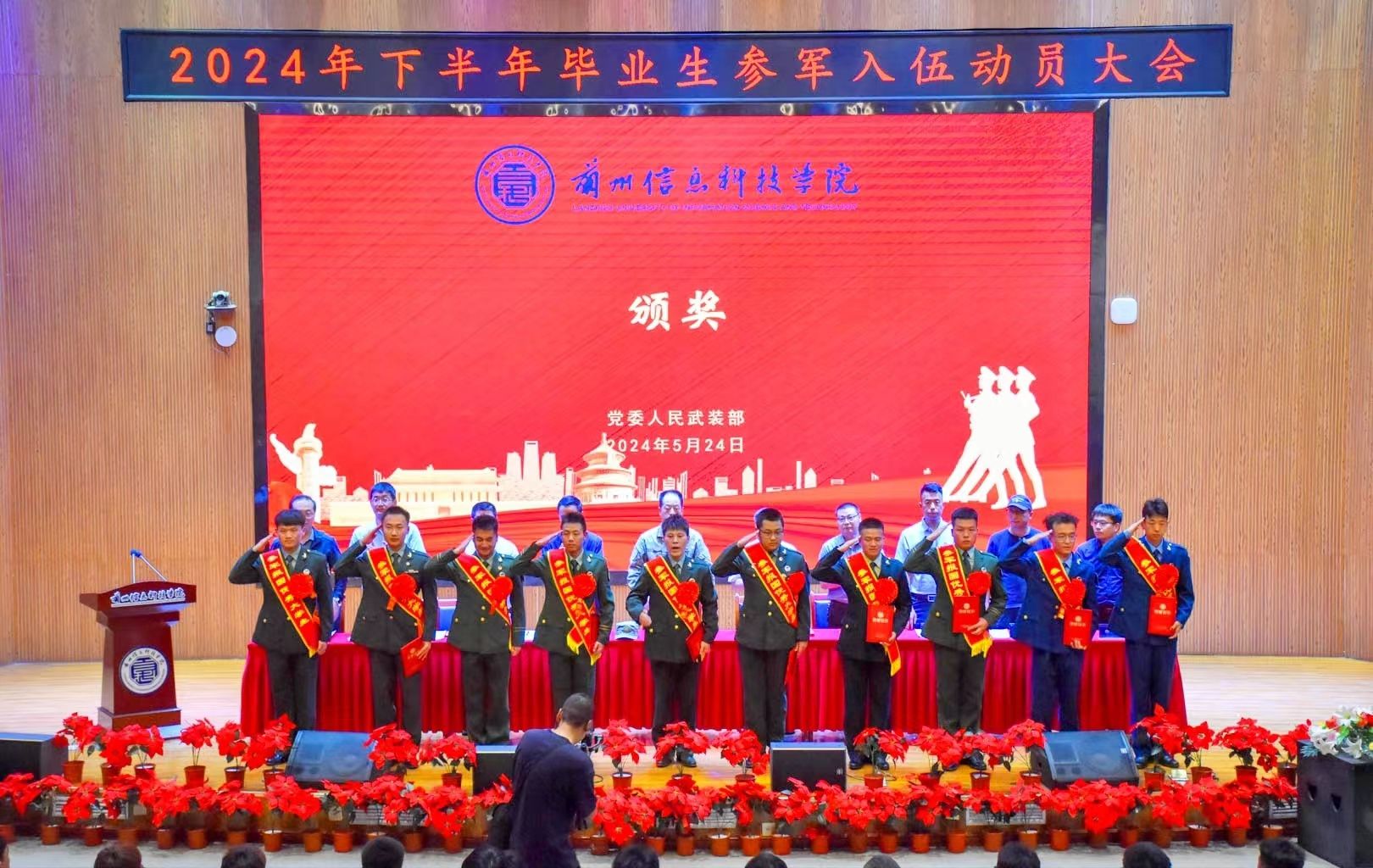 5月24日下午,学校2024年下半年毕业生参军入伍动员大会在2号学术报告厅举行。皋兰县人民武装部副部长李向阳、学校党委书记周怀春、校长助理朱明敏及党委武装部、就业服务中心、团委、各学生发展中心全体人员,2024届毕业班班长、团支书,意向入伍毕业生、退役复学大学生代表参加了会议。