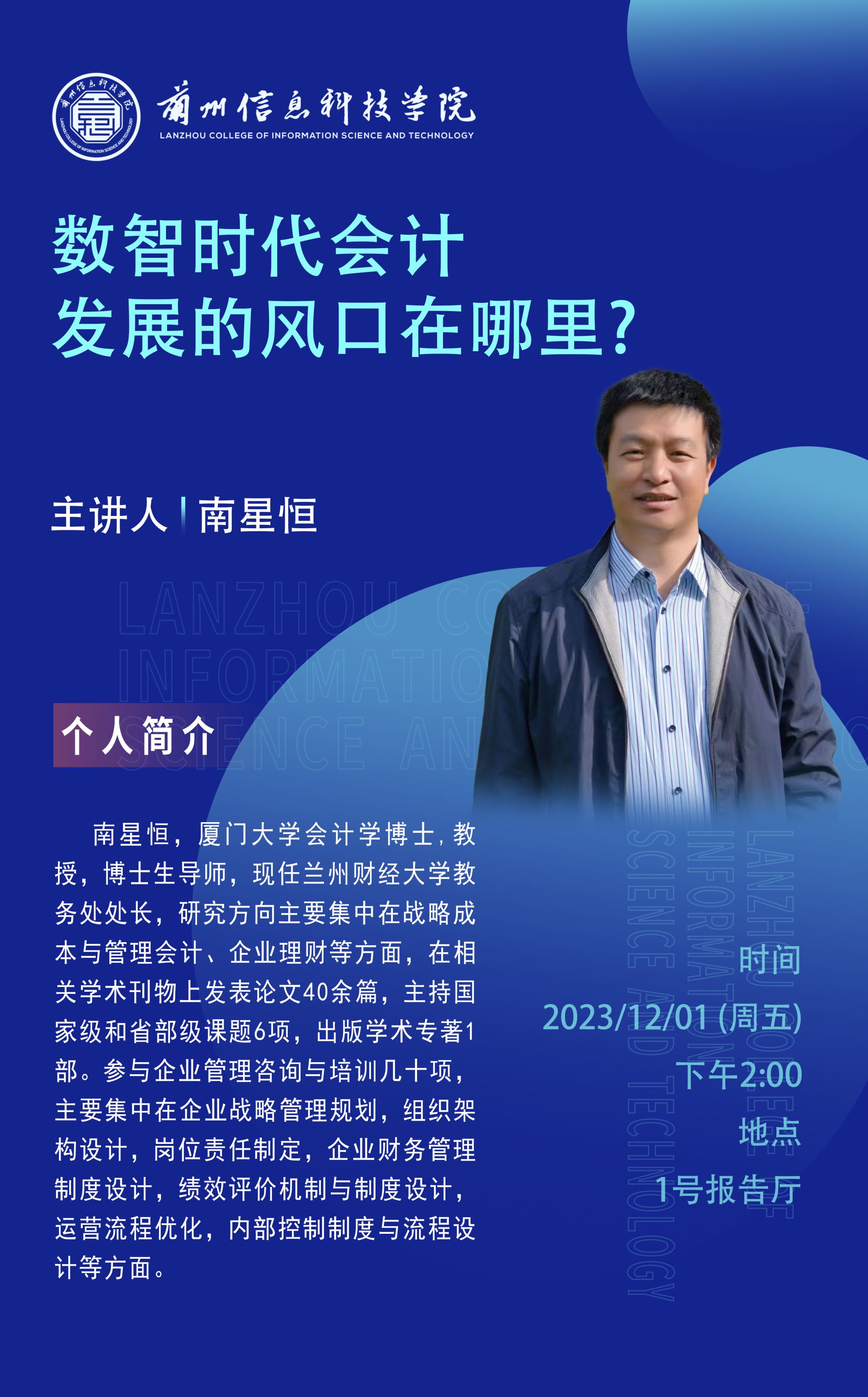 为进一步帮助beat365英国官方网站经济管理学院师生了解专业前沿,营造良好的学术氛围,12月1日,学校在1号报告厅举办《数智时代会计发展的风口在哪里》专题讲座,兰州财经大学教务处处长、博士生导师南星恒教授应邀担任主讲,财务管理专业全体师生聆听、学习了本场讲座。