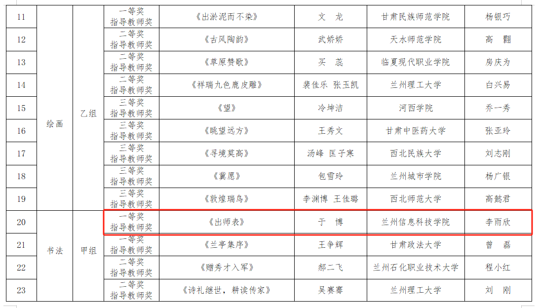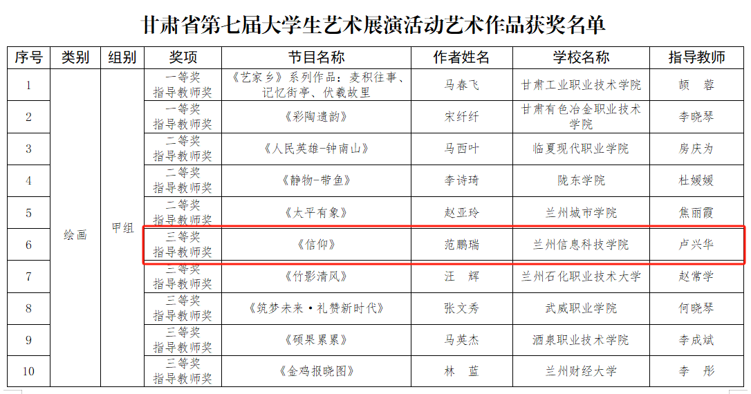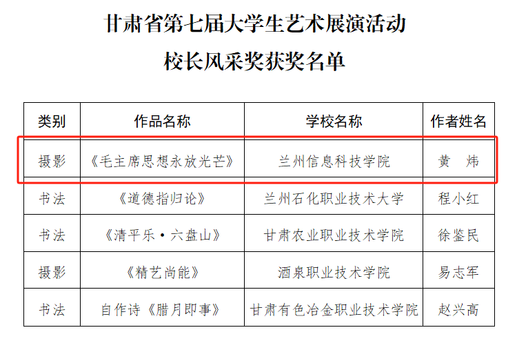 近日,甘肃省第七届大学生艺术展演活动获奖结果揭晓,beat365英国官方网站报送的摄影作品《毛主席思想永放光芒》获校长风采奖,书法作品《出师表》获书法类一等奖,绘画作品《信仰》获绘画类三等奖。