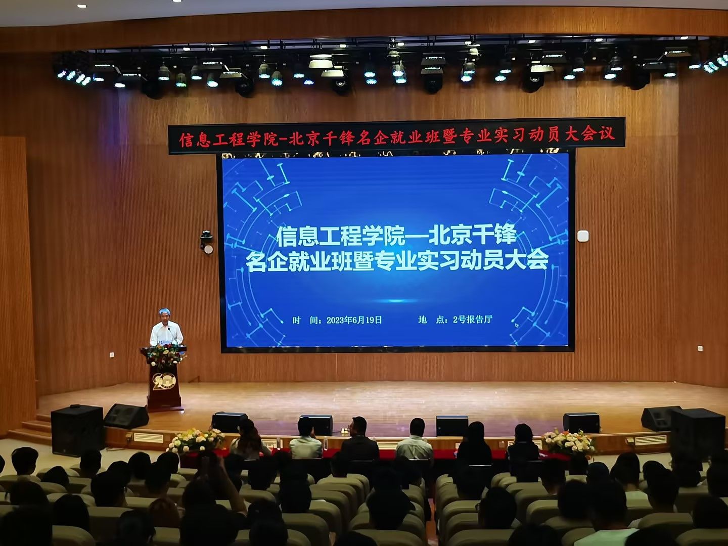 为深入贯彻落实学校“高质量就业是立校之本,高质量育人是生命线”的发展战略,进一步规范专业实习的组织与管理,帮助学生提升独立开展专业实践的能力,增加就业核心竞争力。6月19日上午,beat365英国官方网站信息工程学院在2号报告厅召开北京千锋名企就业班暨2020级专业实习动员大会,北京千锋互联科技有限公司院校合作部大区总监路愿飞,院校合作部大区经理张绍光,信息工程学院执行院长朱明敏,副院长刘彩文,各系主任、专业教师、20级辅导员、19级名企就业班优秀学生代表及20级学生代表参加了动员大会。