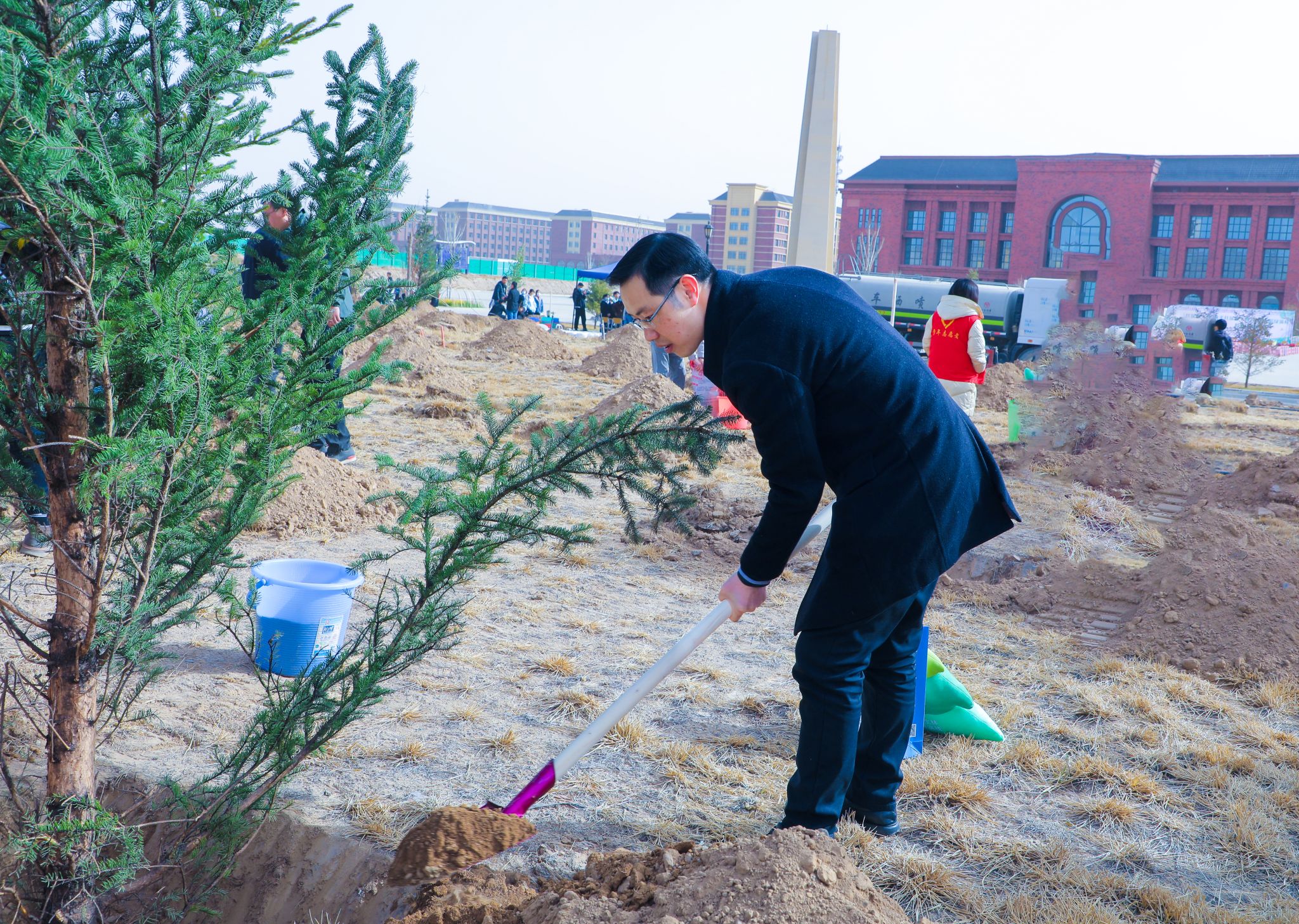 植树志愿活动由基建后勤处和校团委主办,机电工程学院团总支、材料与化工工程学院团总支承办,活动以线上报名的方式邀请师生参与到爱校荣校,绿化校园的活动中来。在上午9点的植树启动仪式上,beat365英国官方网站校长黄炜致词,副校长巴建坤介绍了爱心企业甘肃睿冠再生资源有限公司对此次植树活动捐赠情况的介绍,副校长郭筱磊和校长助理殷学丽分别向爱心企业代表和学校合作企业代表颁发了纪念品。
