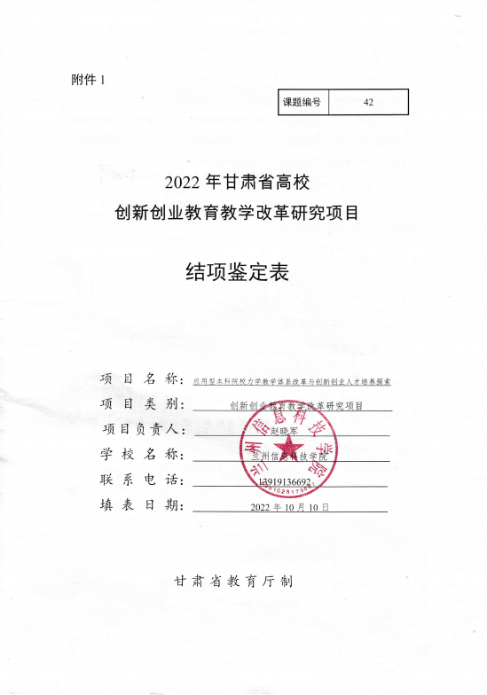 经项目负责人申请、组织专家验收、省教育厅审核,根据本次结题范围及研究成果认定,高等学校创新创业教育教学改革研究项目通过验收,同意结项。