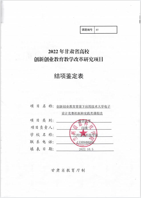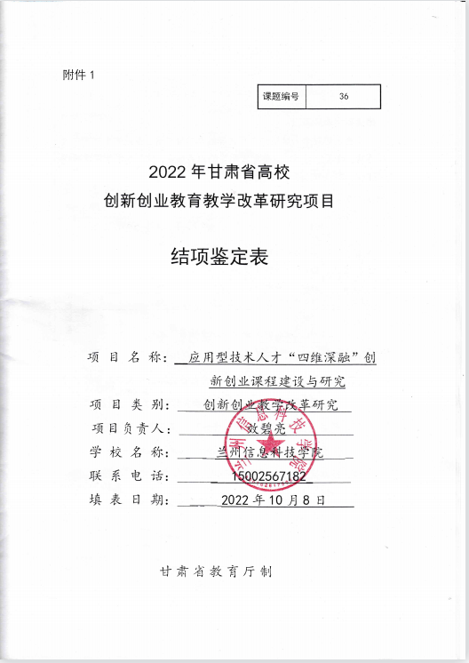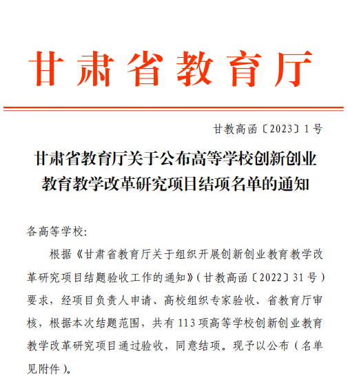近日,甘肃省教育厅公布了2022年创新创业教育教学改革研究项目结项名单,beat365英国官方网站获批的创新创业教育教学改革研究项目3项全部顺利结项。