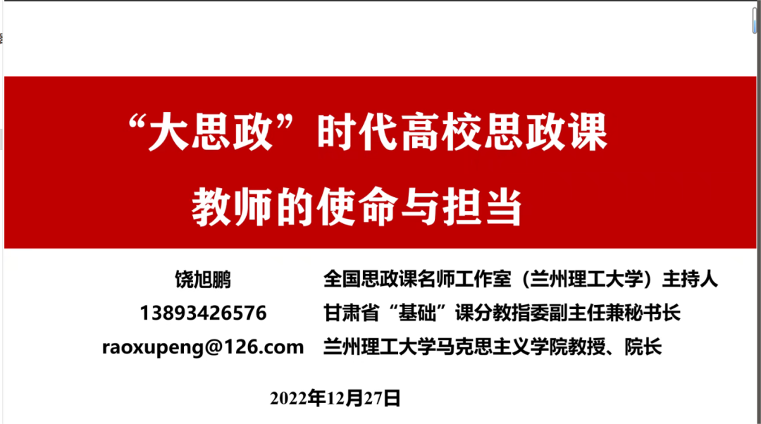 为了深入贯彻落实习近平总书记关于“大思政课”的重要指示批示,教育部等十部门于2022年8月印发关于《全面推进“大思政课”建设的工作方案》,同时甘肃省委教育工委日前也制定了《甘肃省全面推进“大思政课”建设实施方案》意见稿,本次专题培训讲座对于思政课教师进一步树立“大思政课”意识,提高思政课教学质量具有重要意义。