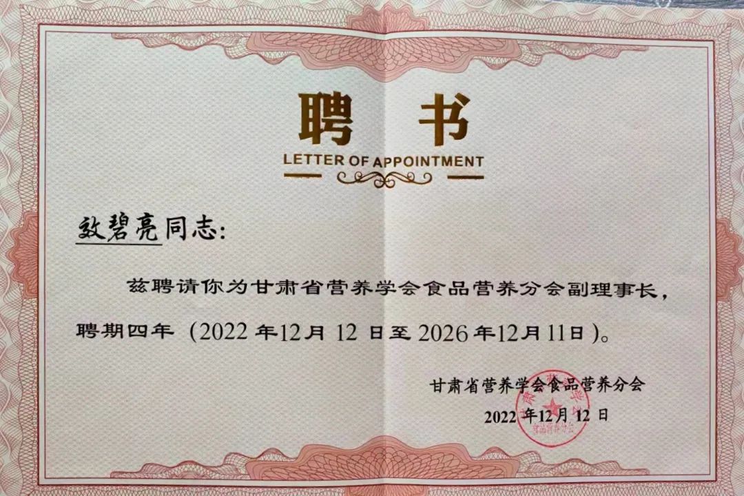 beat365英国官方网站效碧亮教授被聘为甘肃省营养学会食品营养分会副理事长
