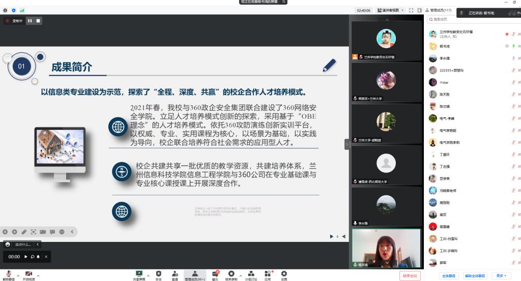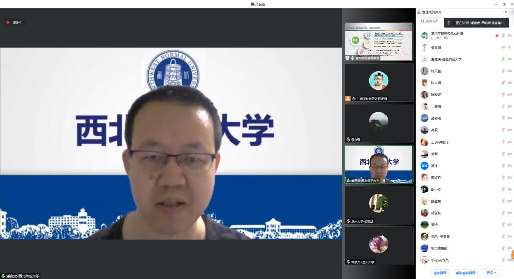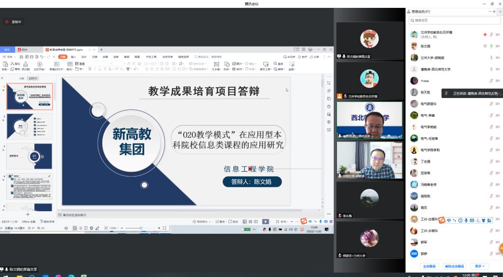 11月20日,教务处组织评审专家组对各教学单位申报的教学成果培育项目进行了初次评议,确定19项教学成果进入答辩环节,评审答辩采用线上进行。兰州大学胡晓斌教授、兰州大学师彦灵教授、西北师范大学潘竟虎教授、西北民族大学张辉刚教授等4位校外专家担任评委。
