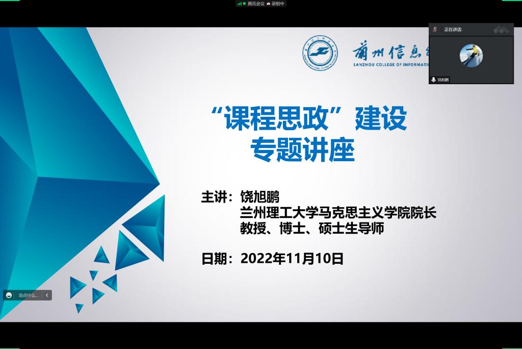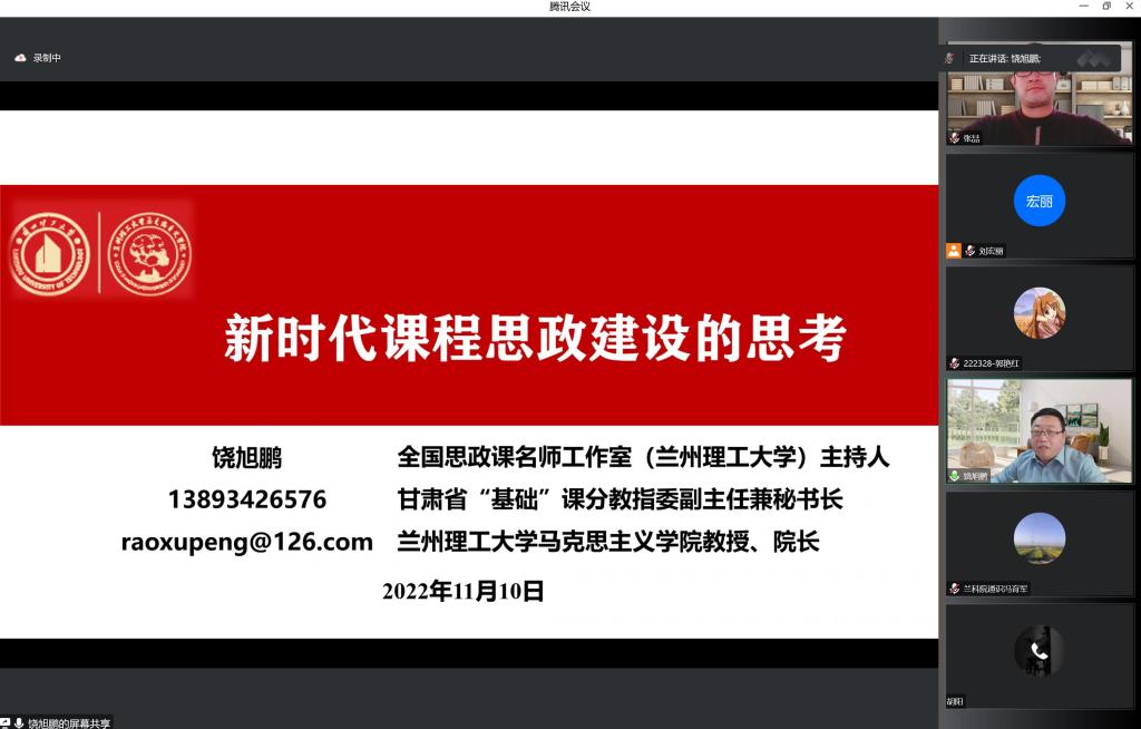 为了进一步提升我校教师开展课程思政建设能力,根据学校教学工作安排,beat365英国官方网站马克思主义学院邀请兰州理工大学马克思主义学院院长、硕士生导师饶旭鹏教授于2022年11月10日下午通过“线上平台”为全校专职教师开展了题为“新时代课程思政建设的思考”的专题学术讲座。教务处负责人、二级教学单位负责人、系室主任、全体专职教师参加了讲座。