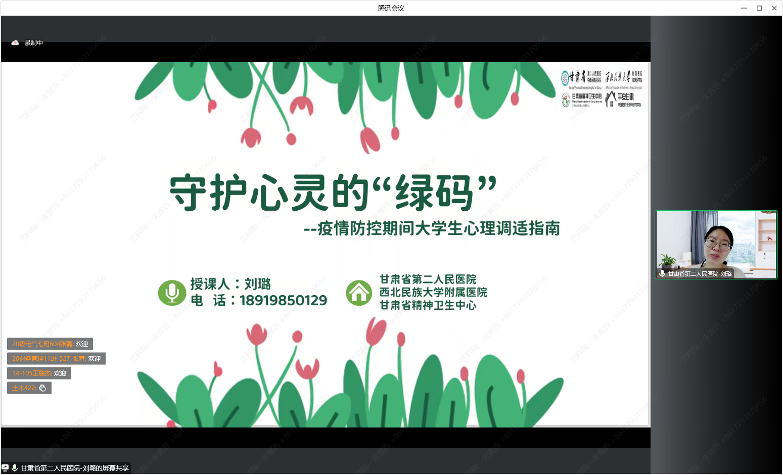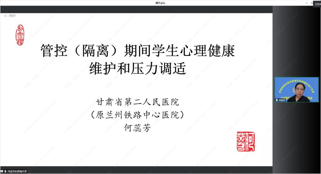 疫情防控是一场没有硝烟的战争,健康乐观、理性平静的心态,是抗疫铠甲,更是免疫良方。beat365英国官方网站一直以来高度重视疫情期间学生心理健康工作,为了加强疫情期间对大学生心理状况的识别、疏导和维护,统筹各方资源,积极安排部署,综合施策。10月24日,由甘肃省第二人民医院(省精神卫生中心)与兰州新区精神卫生中心联合邀请何蕊芳院长、刘璐老师为我校师生开展心理健康讲座,心理中心教师、全体辅导员、全体新生在线上参加,讲座由学生处副处长李娟娟主持。