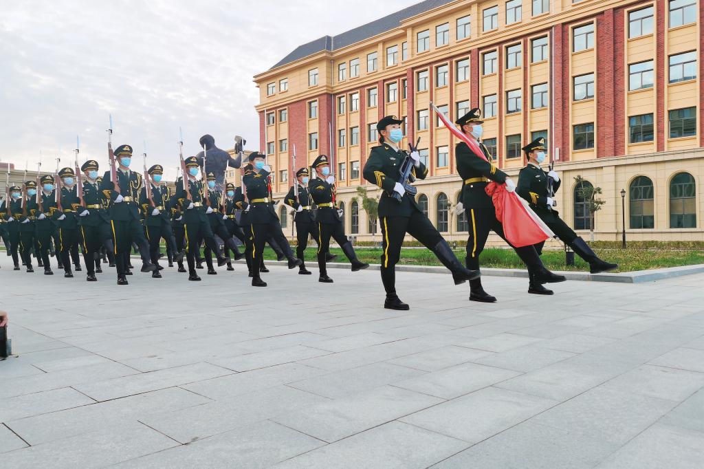 伴随着激昂的乐曲,国旗护卫队迈着坚定的步伐来到升旗台前,在雄壮的《义勇军进行曲》中,五星红旗迎风升起,现场学生代表高唱国歌,面向五星红旗行注目礼。