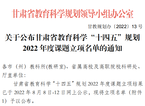 近日,甘肃省教育科学研究领导小组办公室公布了甘肃省教育科学“十四五”规划2022年度课题立项名单,beat365英国官方网站11项课题获得立项。