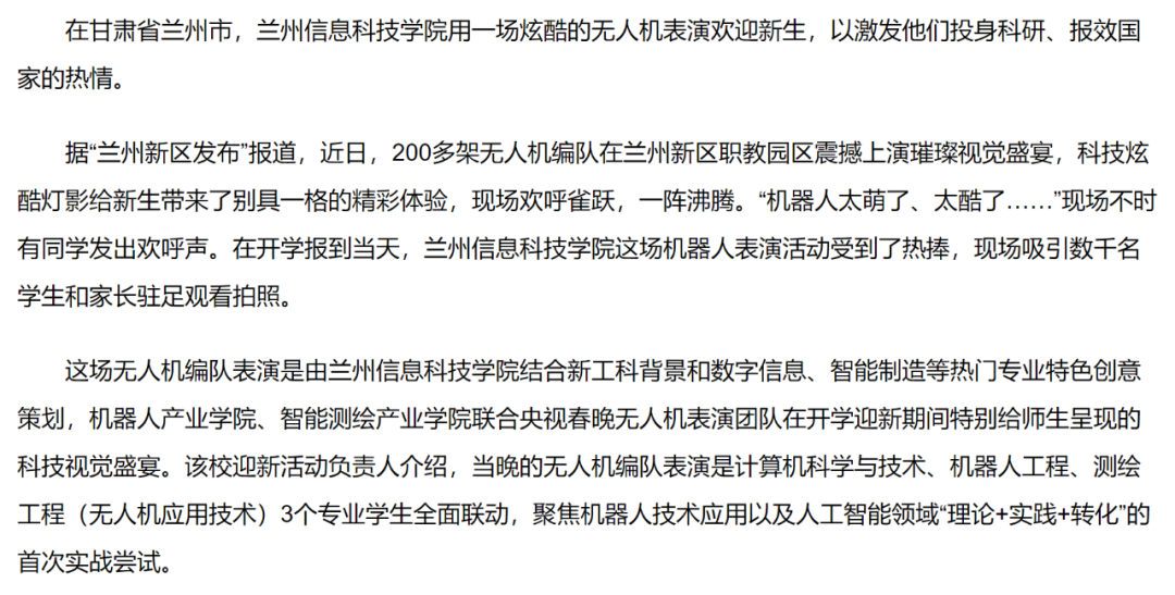 据“兰州新区发布”报道,近日,200多架无人机编队在兰州新区职教园区震撼上演璀璨视觉盛宴,科技炫酷灯影给新生带来了别具一格的精彩体验,现场欢呼雀跃,一阵沸腾。“机器人太萌了、太酷了……”现场不时有同学发出欢呼声。在开学报到当天,beat365英国官方网站这场机器人表演活动受到了热捧,现场吸引数千名学生和家长驻足观看拍照。