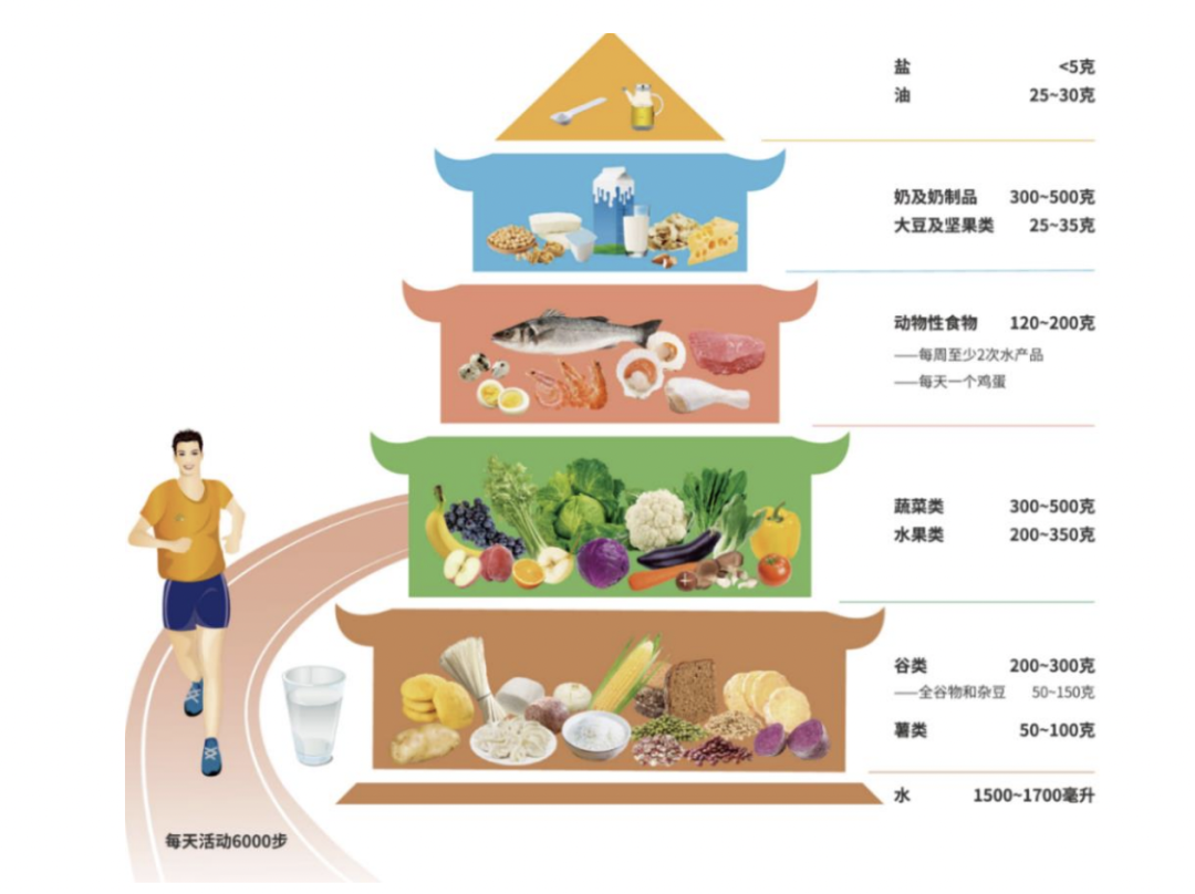 第四,确保食物种类齐全、数量充足、比例合适。人体需要的基本食物分为5大类:包括谷薯类、蔬菜水果类、畜禽肉蛋奶类、大豆坚果类和油脂类。